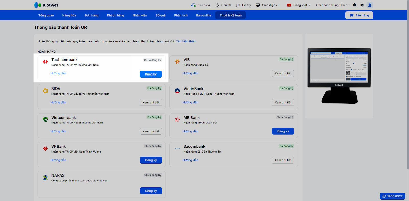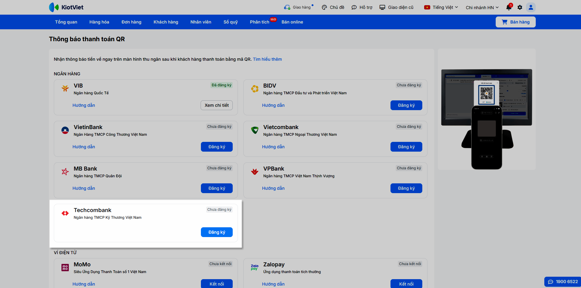 – Để gia tăng hiệu quả và tốc độ xử lý đơn hàng, bạn có thể kết hợp dịch vụ thông báo thanh toán của Techcombank với các tiện ích KiotViet đang hỗ trợ như: