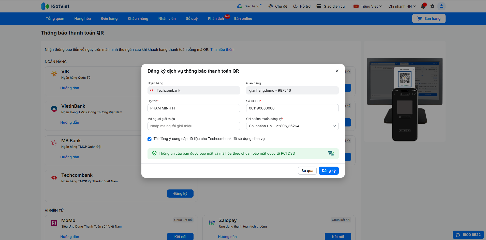 Để kích hoạt tính năng nhận thông báo thanh toán tự động, bạn cần hoàn tất việc đăng ký dịch vụ trên KiotViet và xác thực liên kết trên ứng dụng Techcombank Mobile.