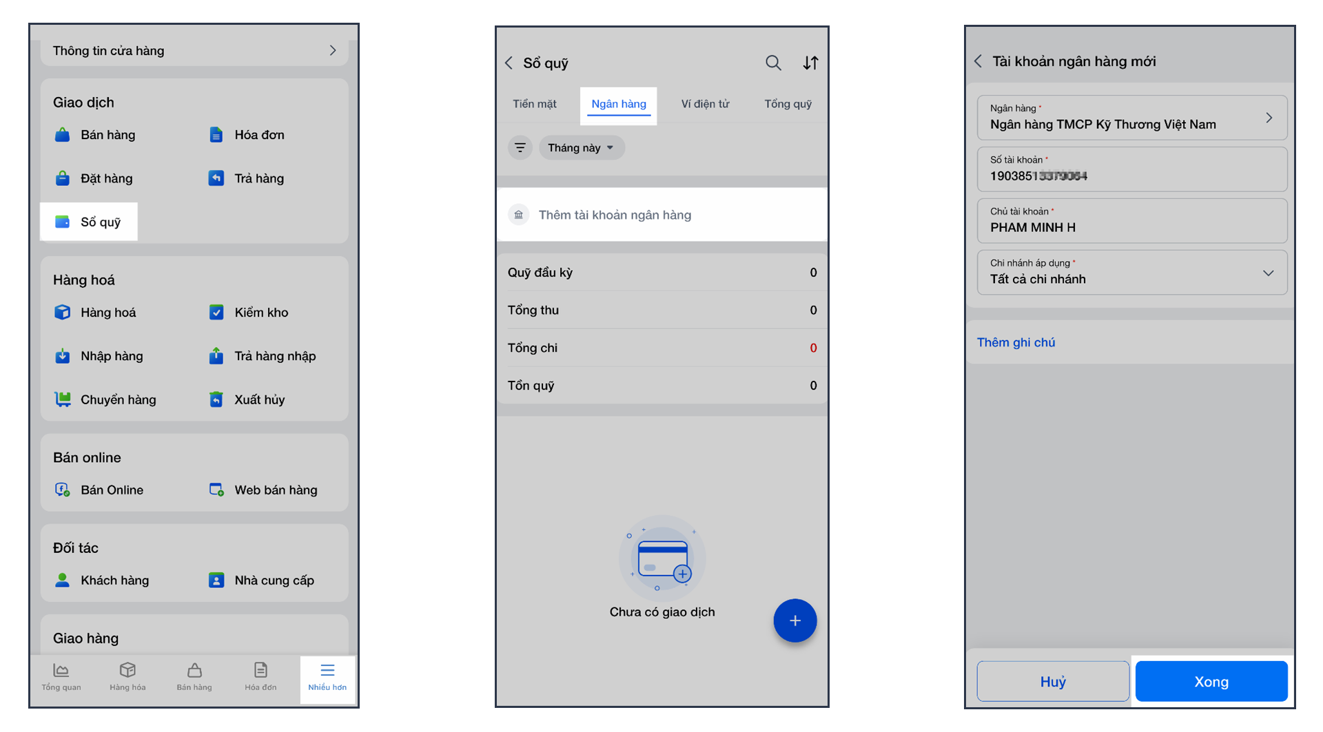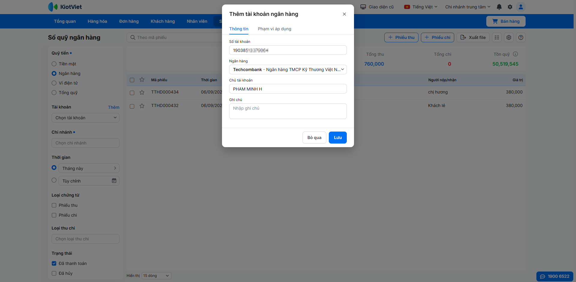 2. Thêm tài khoản Techcombank vào KiotViet