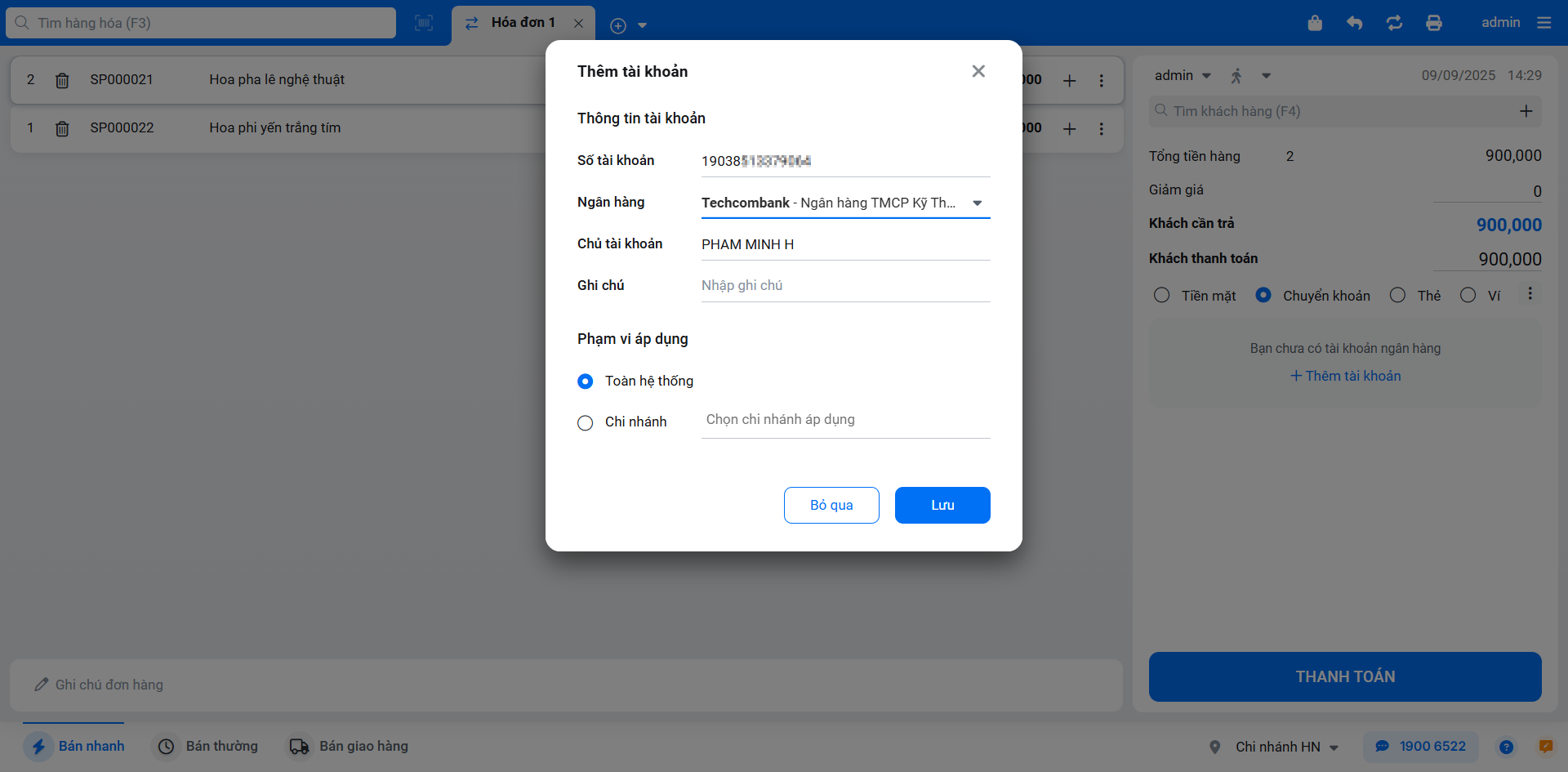 – Ngoài ra, bạn cũng có thể thực hiện thao tác này ngay trên màn hình Bán hàng bằng cách chọn phương thức Chuyển khoản và nhấn Thêm tài khoản.