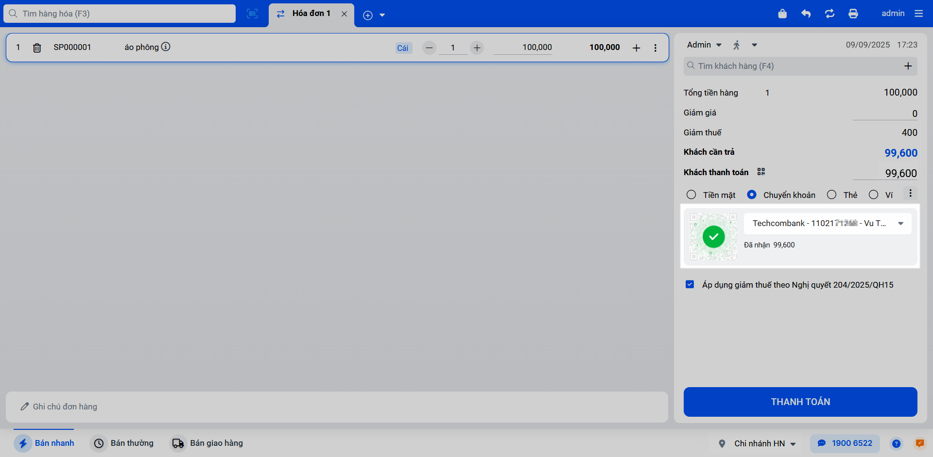 – Khi tạo hóa đơn, bạn chọn phương thức thanh toán là tài khoản Techcombank đã liên kết để hiển thị mã QR.
