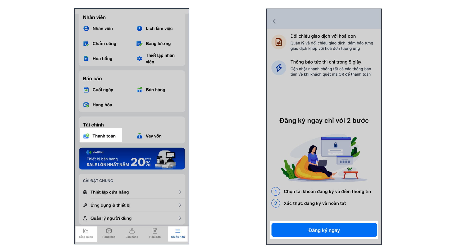 – Từ menu Nhiều hơn hoặc Tổng quan, bạn chọn mục Thanh toán -> nhấn Đăng ký ngay