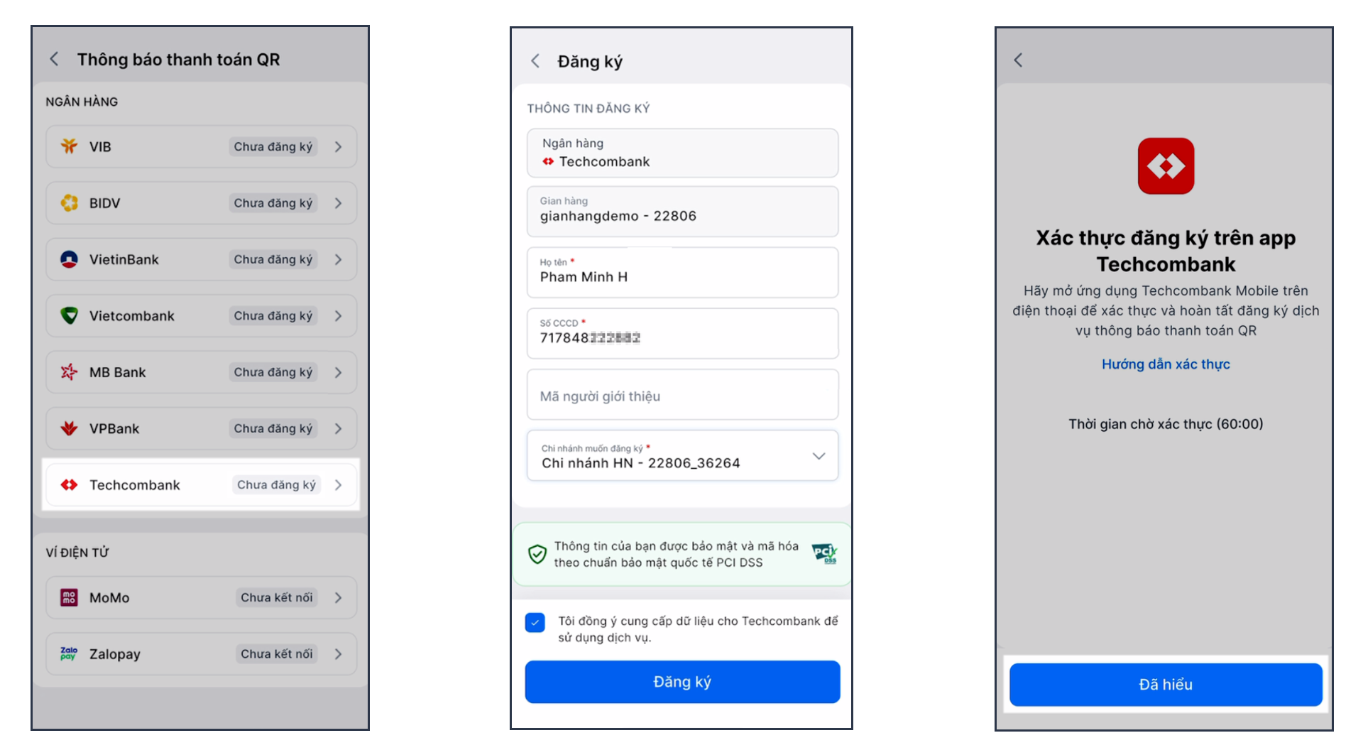 - Họ tên, Số CCCD: Phải trùng với thông tin đăng ký tại ngân hàng.
