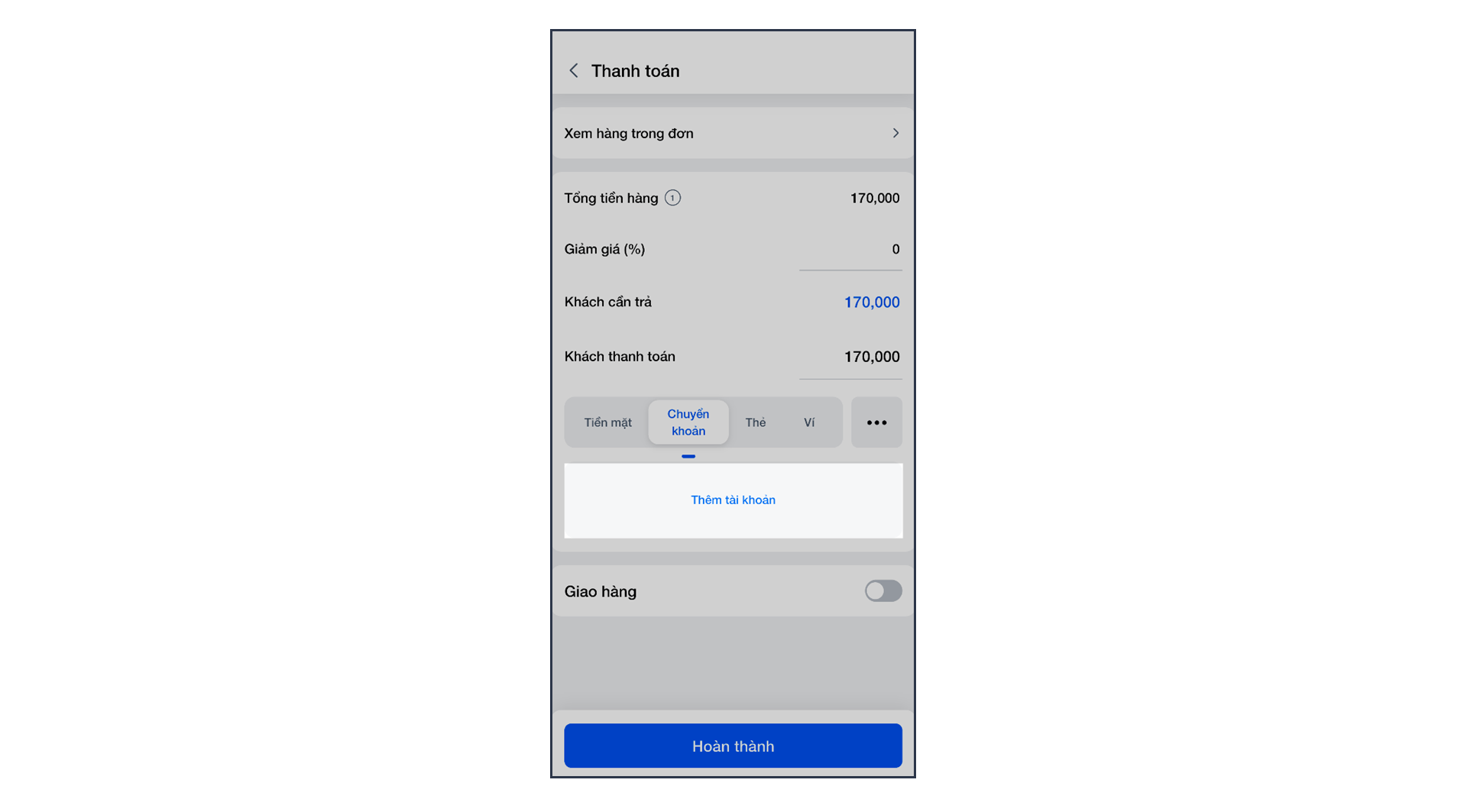 Ngoài ra, bạn cũng có thể thực hiện thao tác này ngay trên màn hình Bán hàng bằng cách chọn phương thức Chuyển khoản và nhấn Thêm tài khoản.