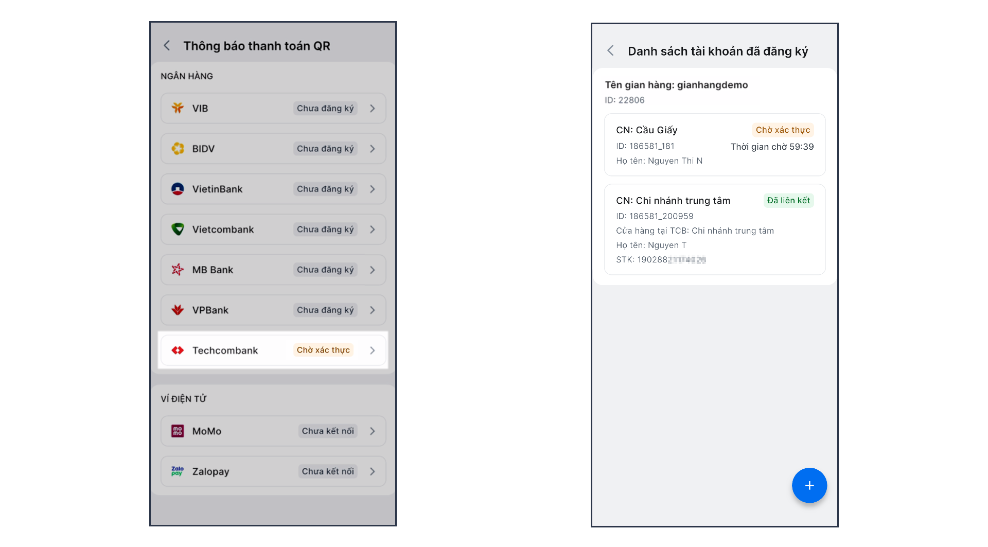- Đối với một chi nhánh của một gian hàng: Chỉ có thể liên kết với một tài khoản Techcombank tại một thời điểm.