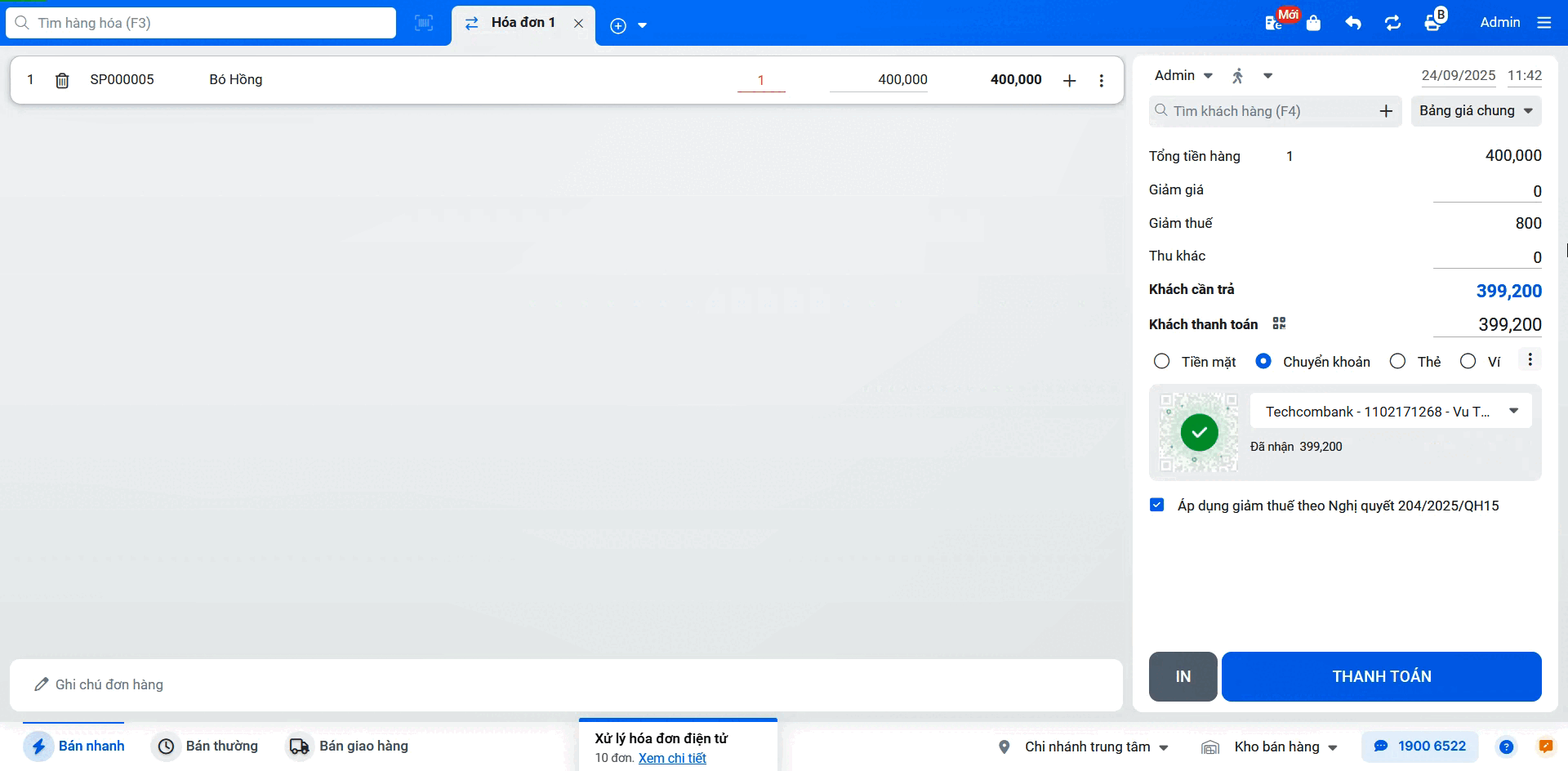 – Sau khi khách hàng quét mã và chuyển khoản thành công, màn hình Bán hàng sẽ ngay lập tức hiển thị thông báo kết quả giao dịch.