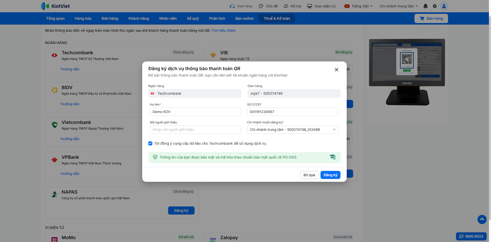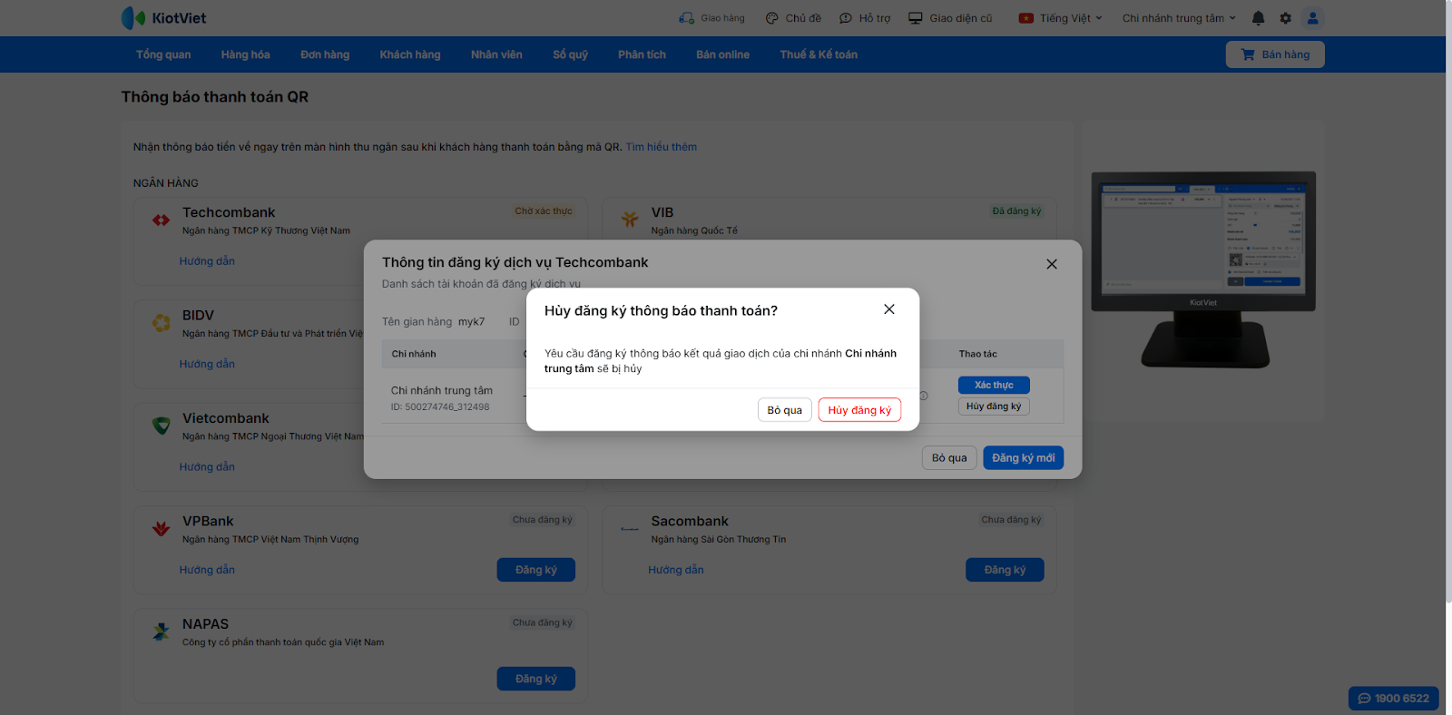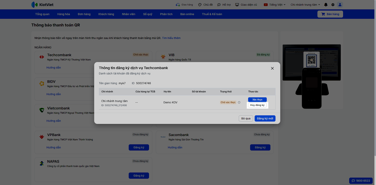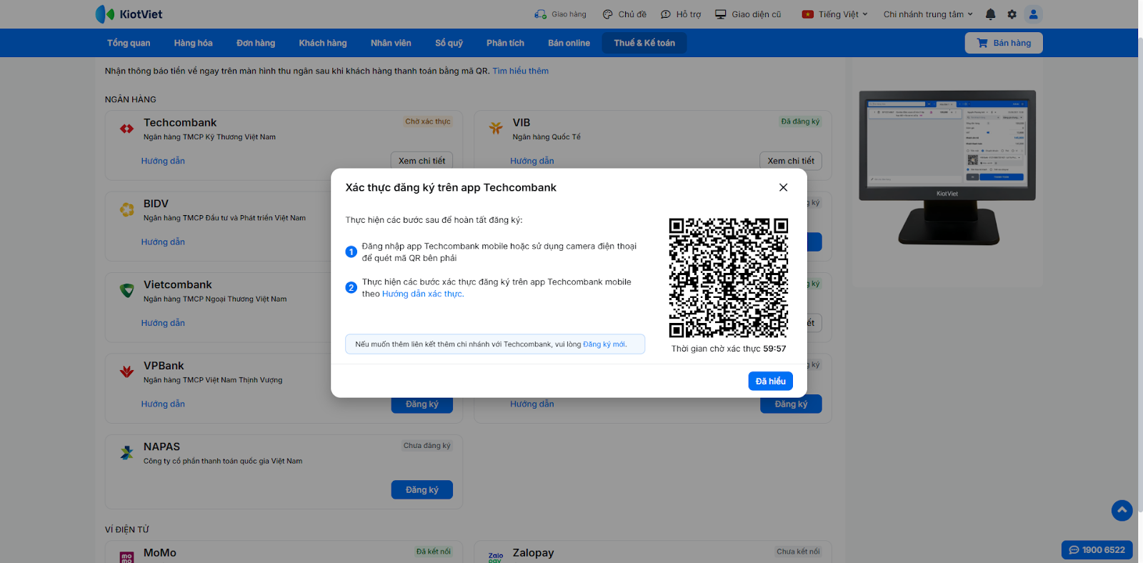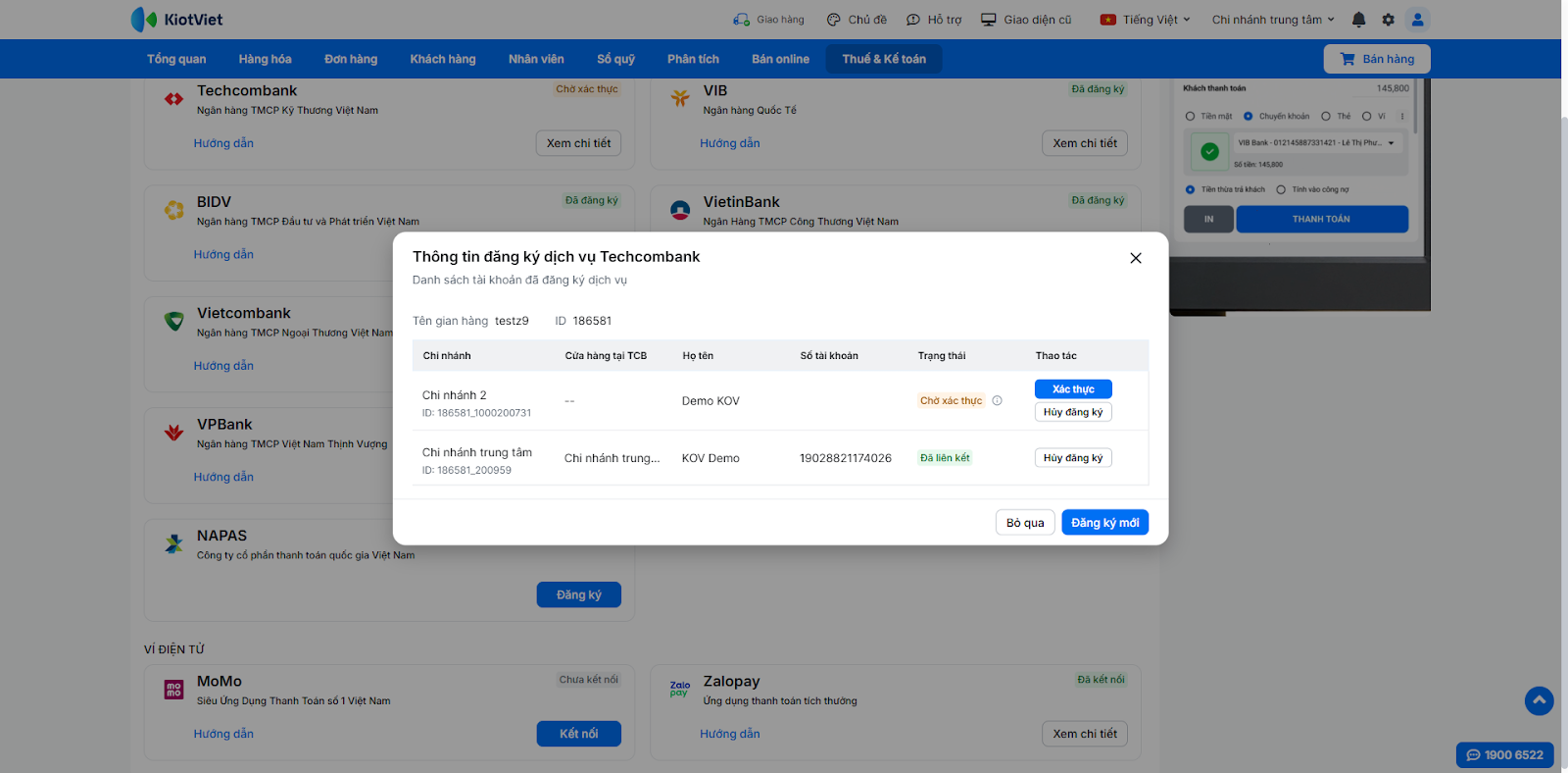Sau khi liên kết thành công, bước tiếp theo là khai báo số tài khoản này trong KiotViet để hệ thống nhận diện khi thanh toán.