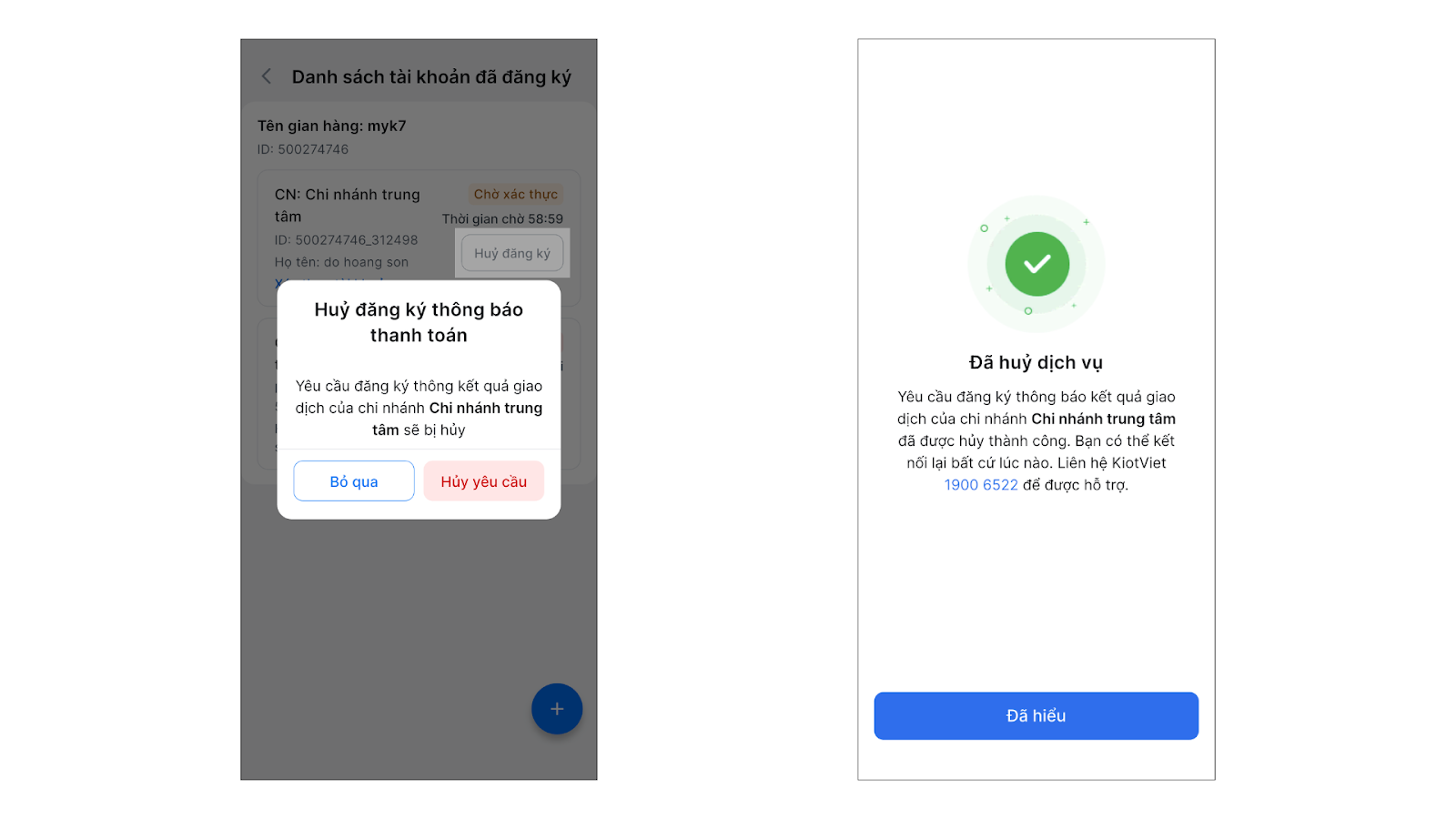(1) Tại mục xem chi tiết tài khoản (như thao tác trên), nhấn vào nút Hủy đăng ký trên yêu cầu có trạng thái Chờ xác thực.