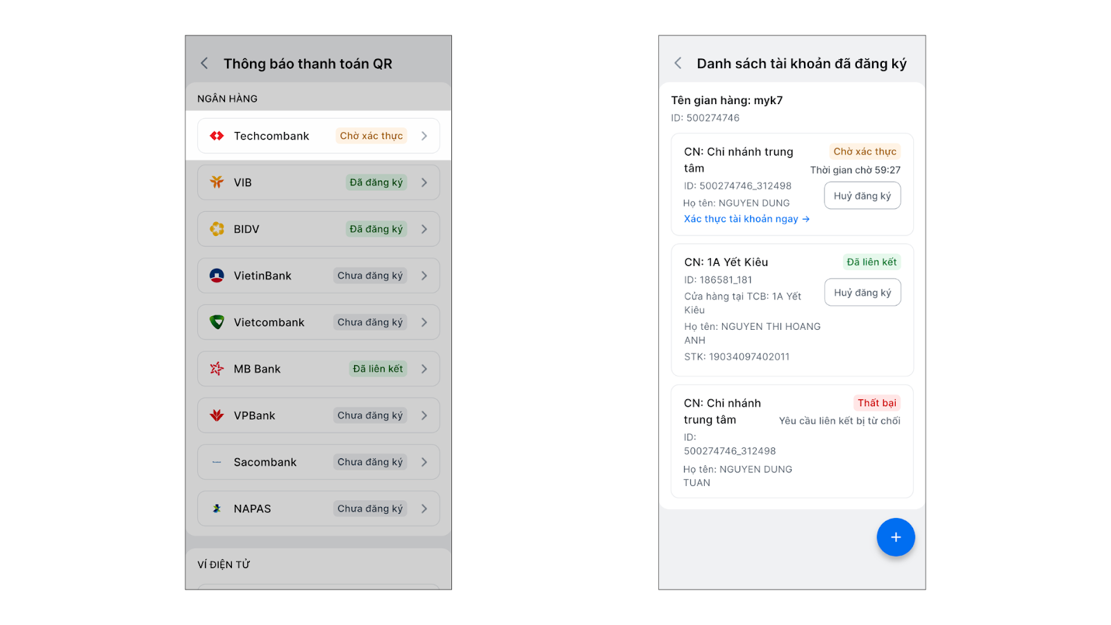 – Ứng dụng sẽ hiển thị danh sách các chi nhánh cùng trạng thái liên kết (Thành công, Thất bại, Chờ xác thực). Bạn có thể nhấn cộng