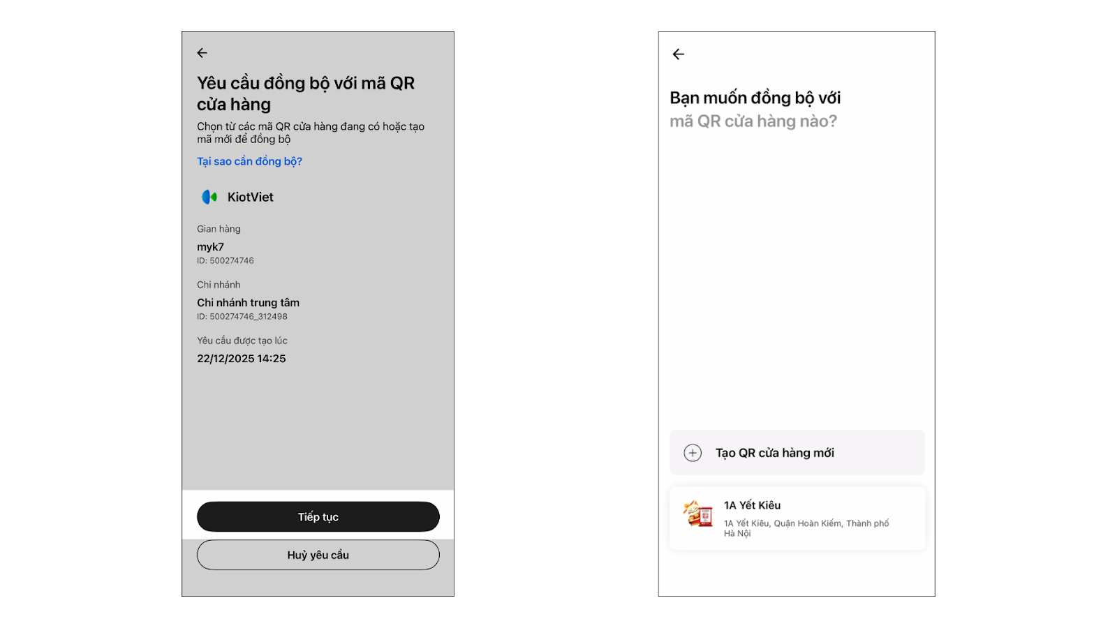 – Sau khi quét mã QR xác thực đăng ký → hệ thống điều hướng thẳng vào yêu cầu chờ xác thực trên ứng dụng Techcombank Mobile → bạn nhấn Tiếp tục → chọn cửa hàng Techcombank muốn đồng bộ hoặc Tạo QR cửa hàng mới.