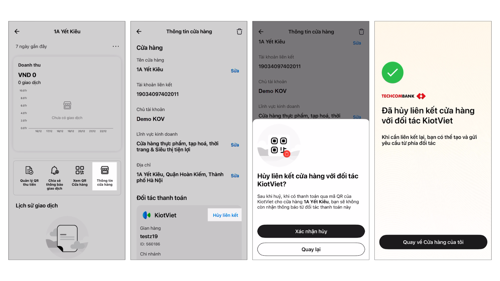 (2) Chọn Thông tin cửa hàng → nhấn Hủy liên kết → Xác nhận hủy và xác thực sinh trắc học để hoàn thành.