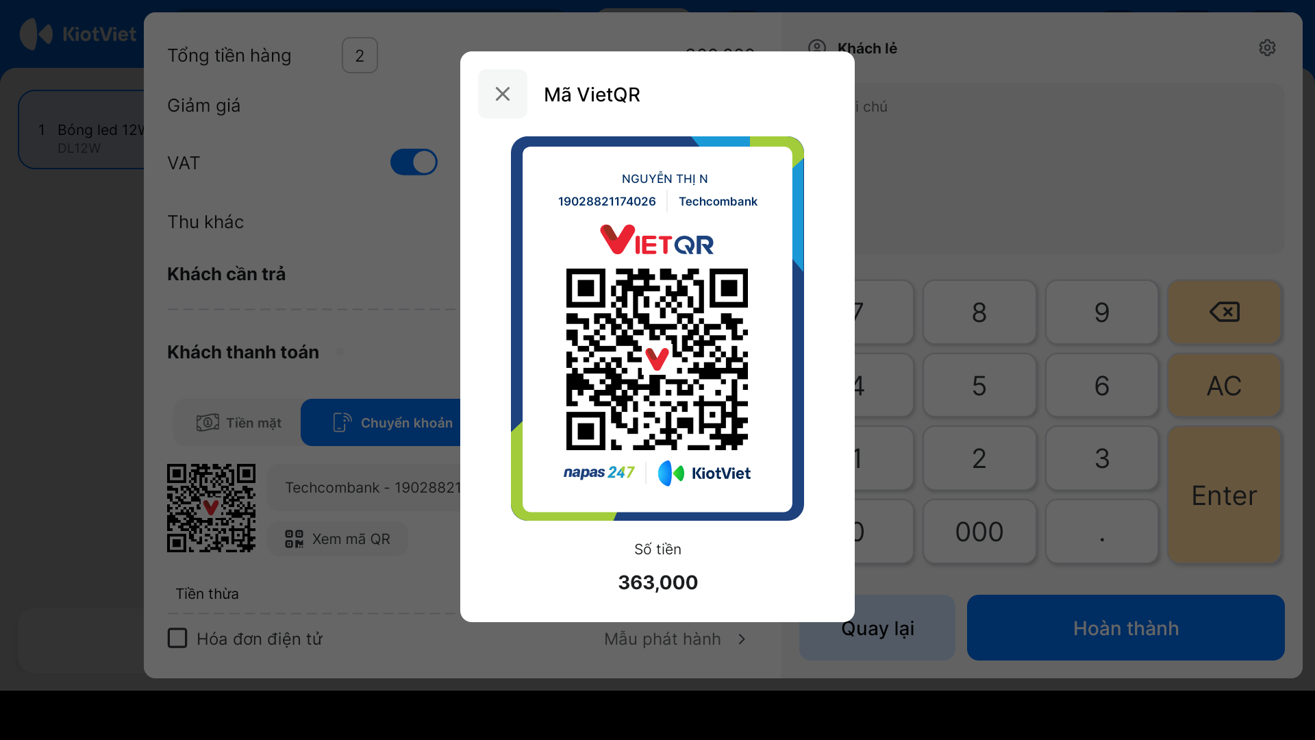 Nhằm hỗ trợ các gian hàng thúc đẩy việc thanh toán phi tiền mặt, KiotViet kết hợp cùng ngân hàng Techcombank đã ra mắt tính năng thanh toán chuyển khoản bằng phương pháp quét mã VietQR và nhận thông báo kết quả ngay trên phần mềm.