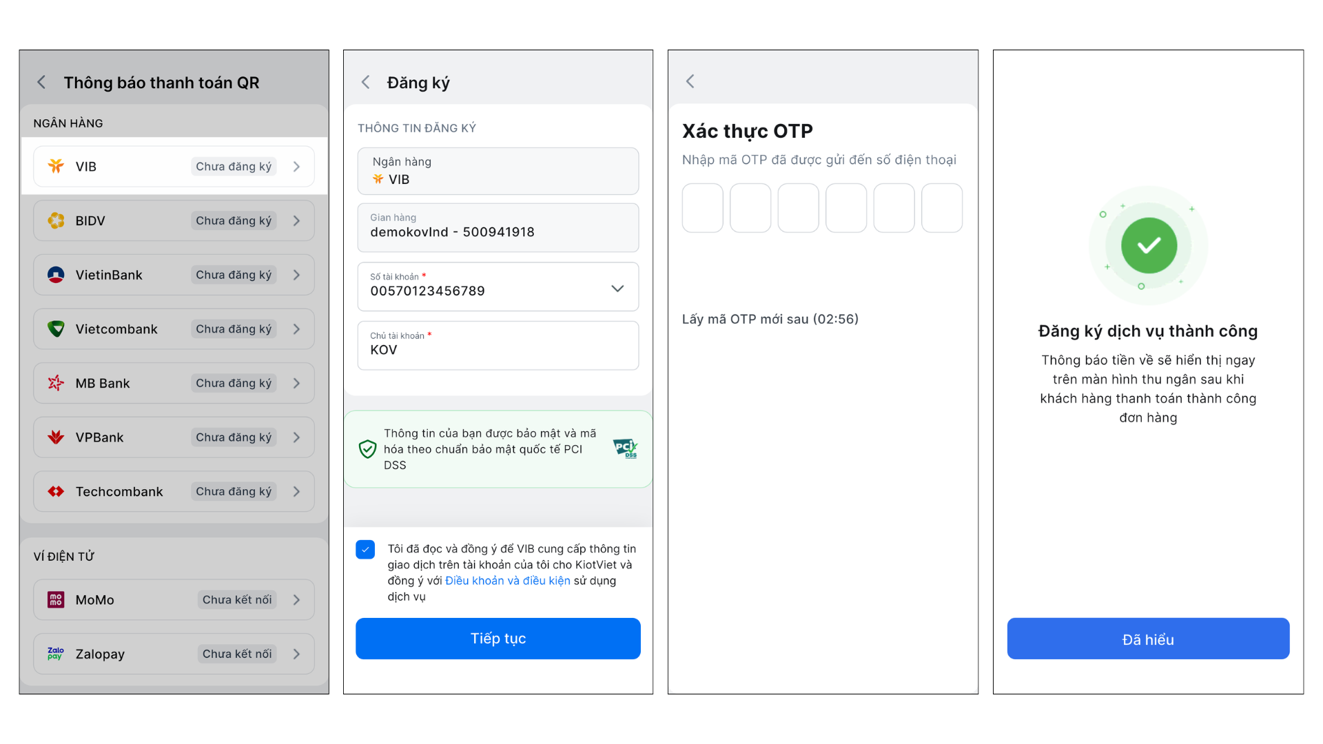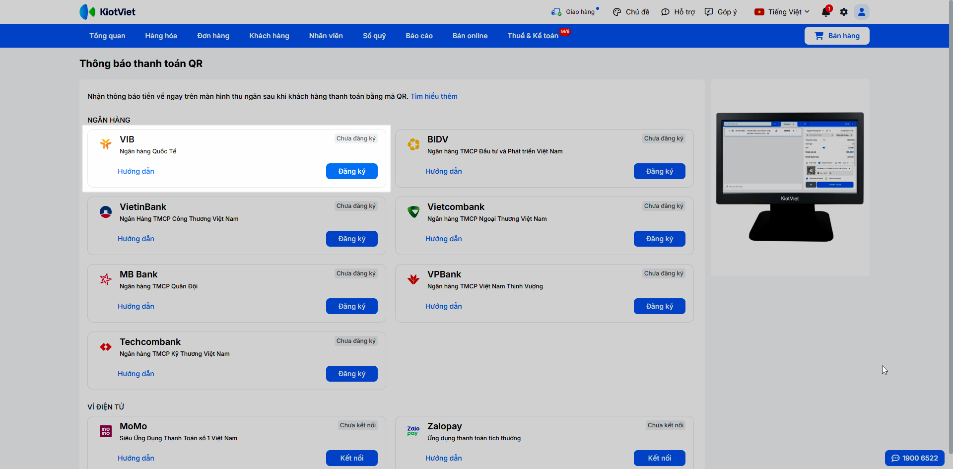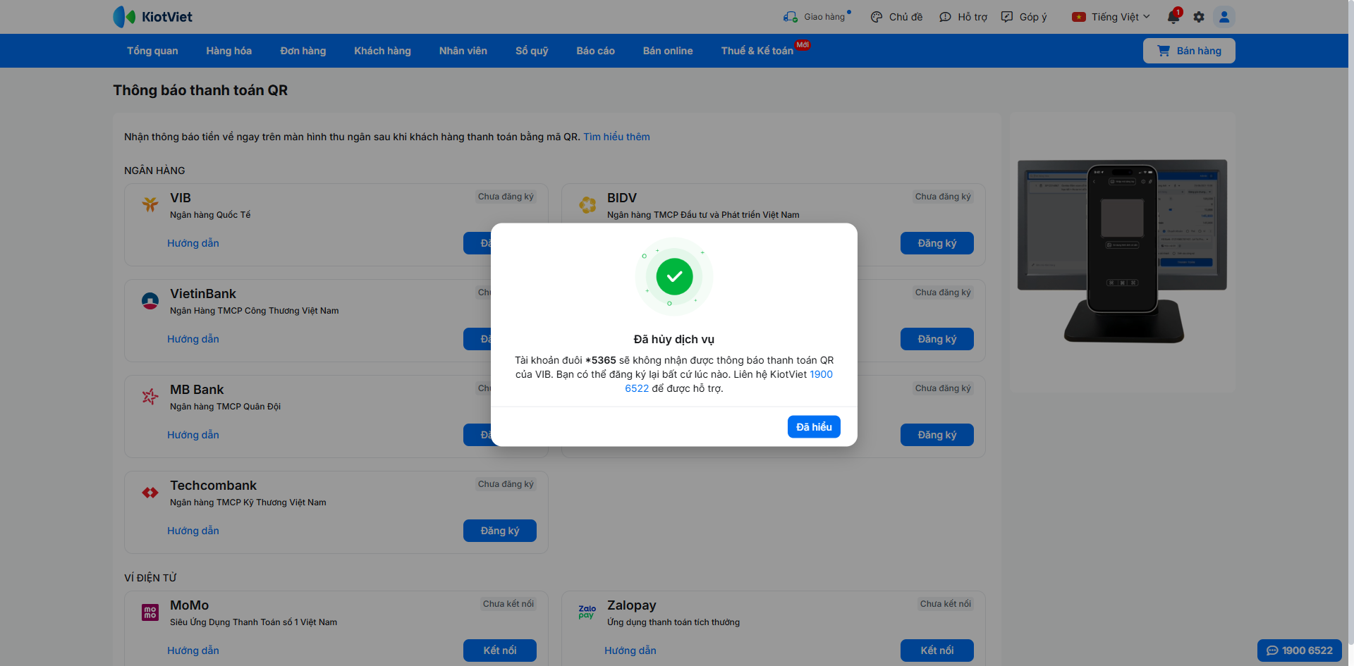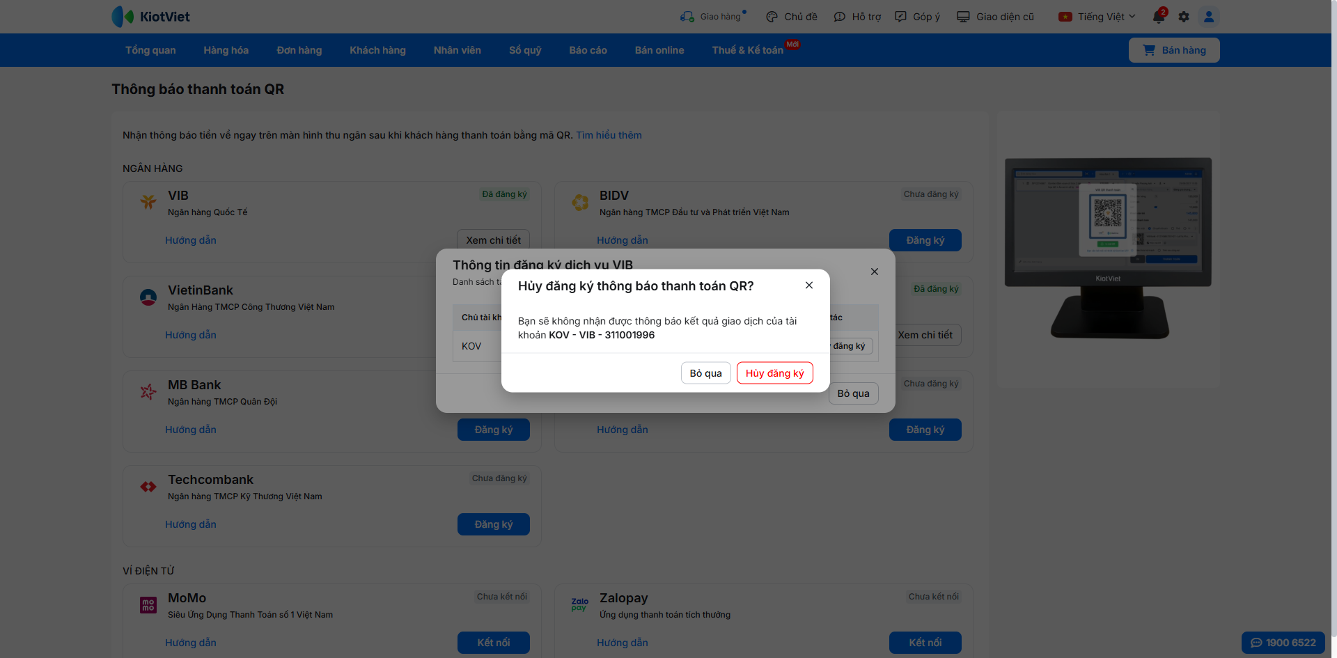 - Mỗi gian hàng KiotViet tại một thời điểm chỉ có thể liên kết với một tài khoản VIB duy nhất.