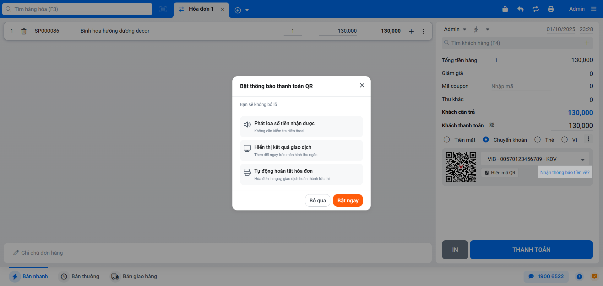 - Ngay sau khi Lưu thông tin thêm tài khoản ngân hàng VIB -> hệ thống hiển thị popup Bật thông báo thanh toán QR, bạn chọn Bật ngay