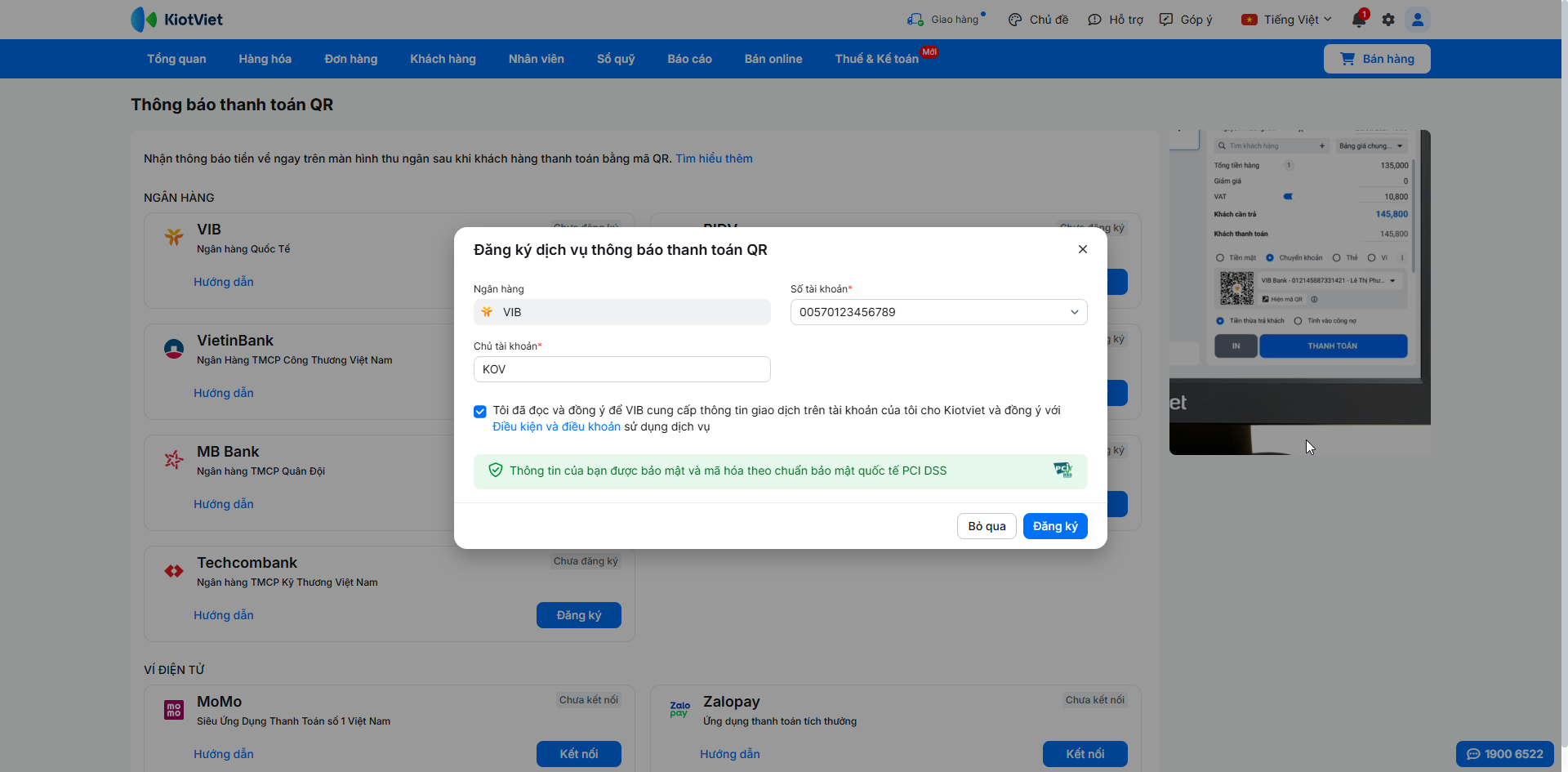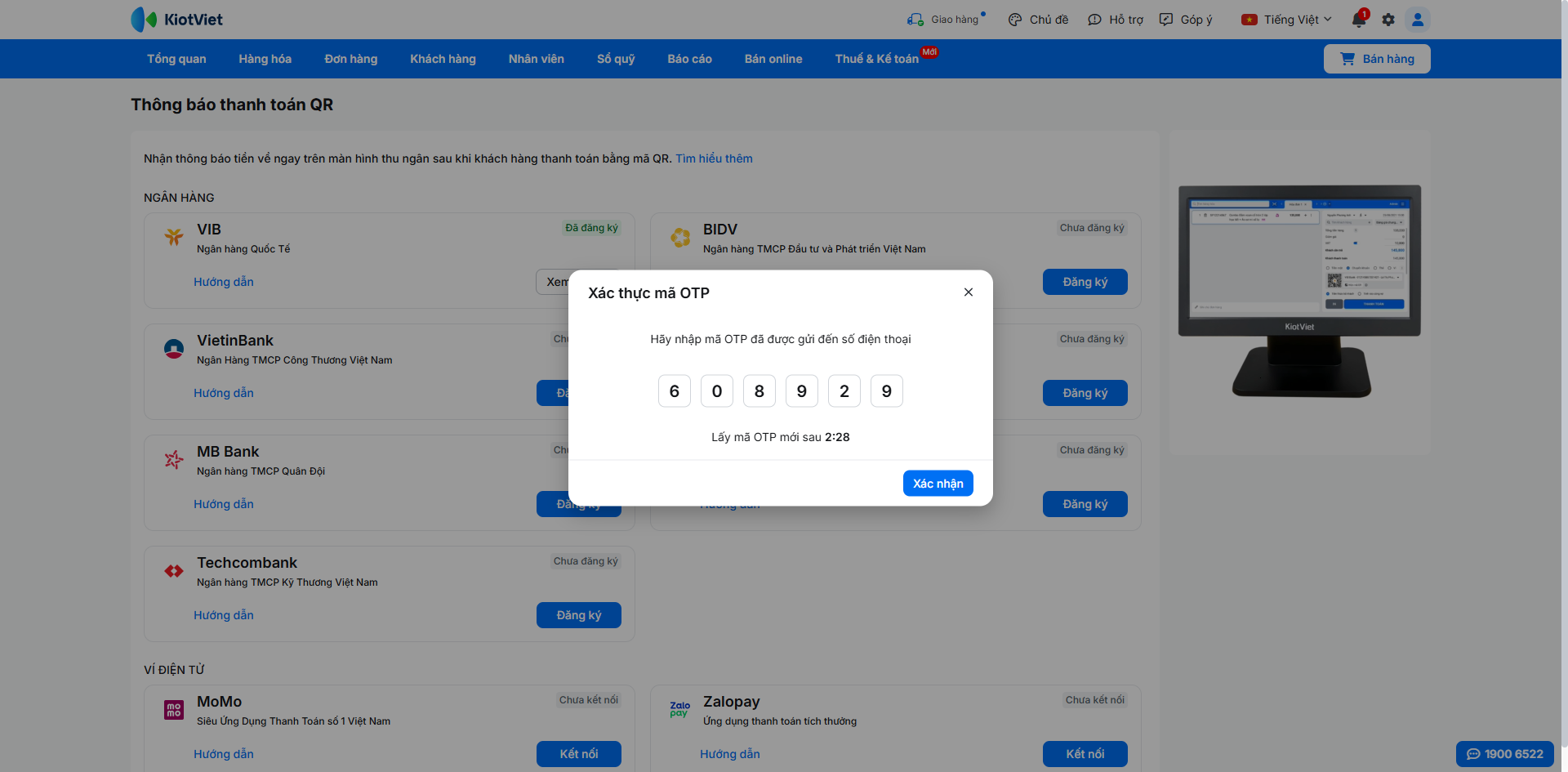 Để nhận thông báo thanh toán tự động, bạn cần kích hoạt dịch vụ trực tiếp trên phần mềm KiotViet và xác thực bằng mã OTP.