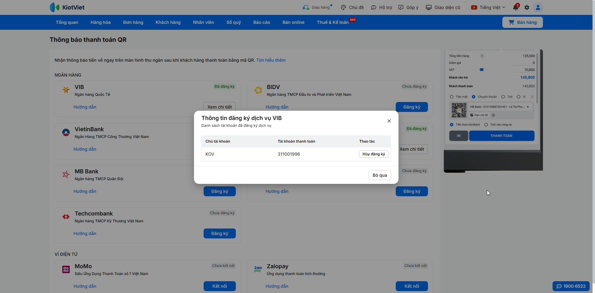 - Tình huống: Khi bạn cần kiểm tra lại thông tin tài khoản VIB nào đang được kết nối để nhận thông báo tự động trên KiotViet.