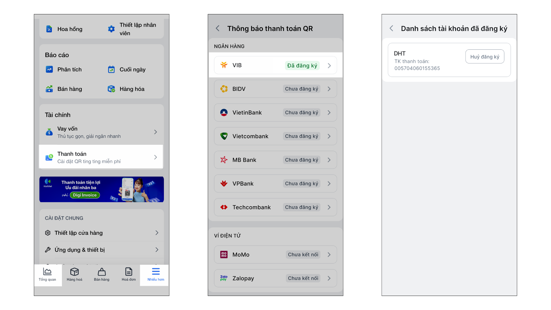 - Hỗ trợ nhân viên bán hàng: Nhận thông báo thanh toán thành công ngay lập tức trên màn hình bán hàng, giúp xác nhận giao dịch nhanh chóng mà không cần kiểm tra trên ứng dụng ngân hàng.