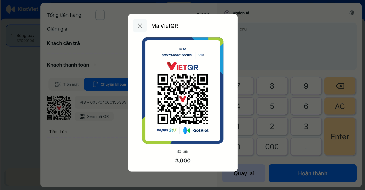 - Sau khi khách hàng quét mã và chuyển khoản thành công, màn hình Bán hàng sẽ ngay lập tức hiển thị thông báo kết quả giao dịch.