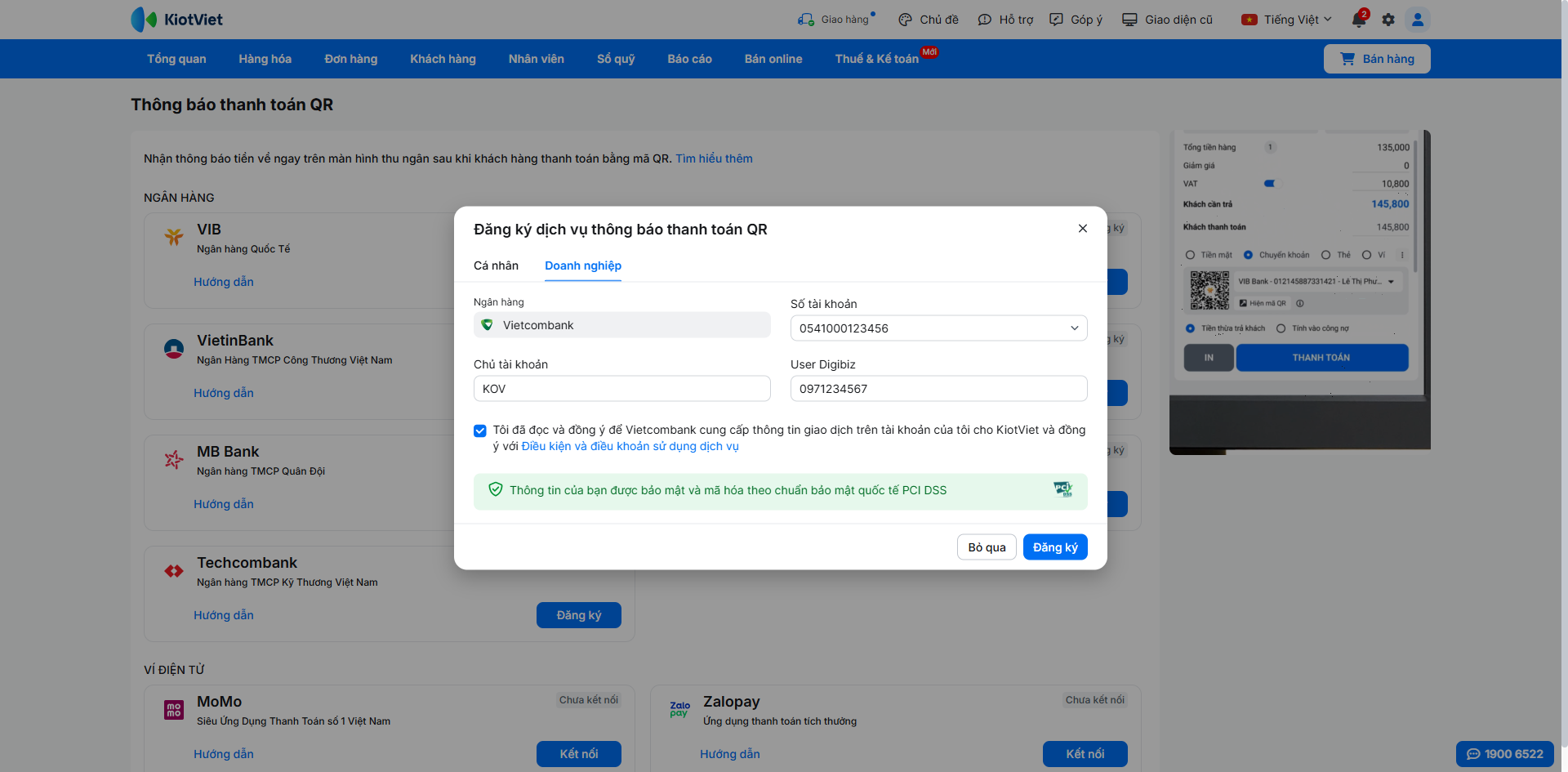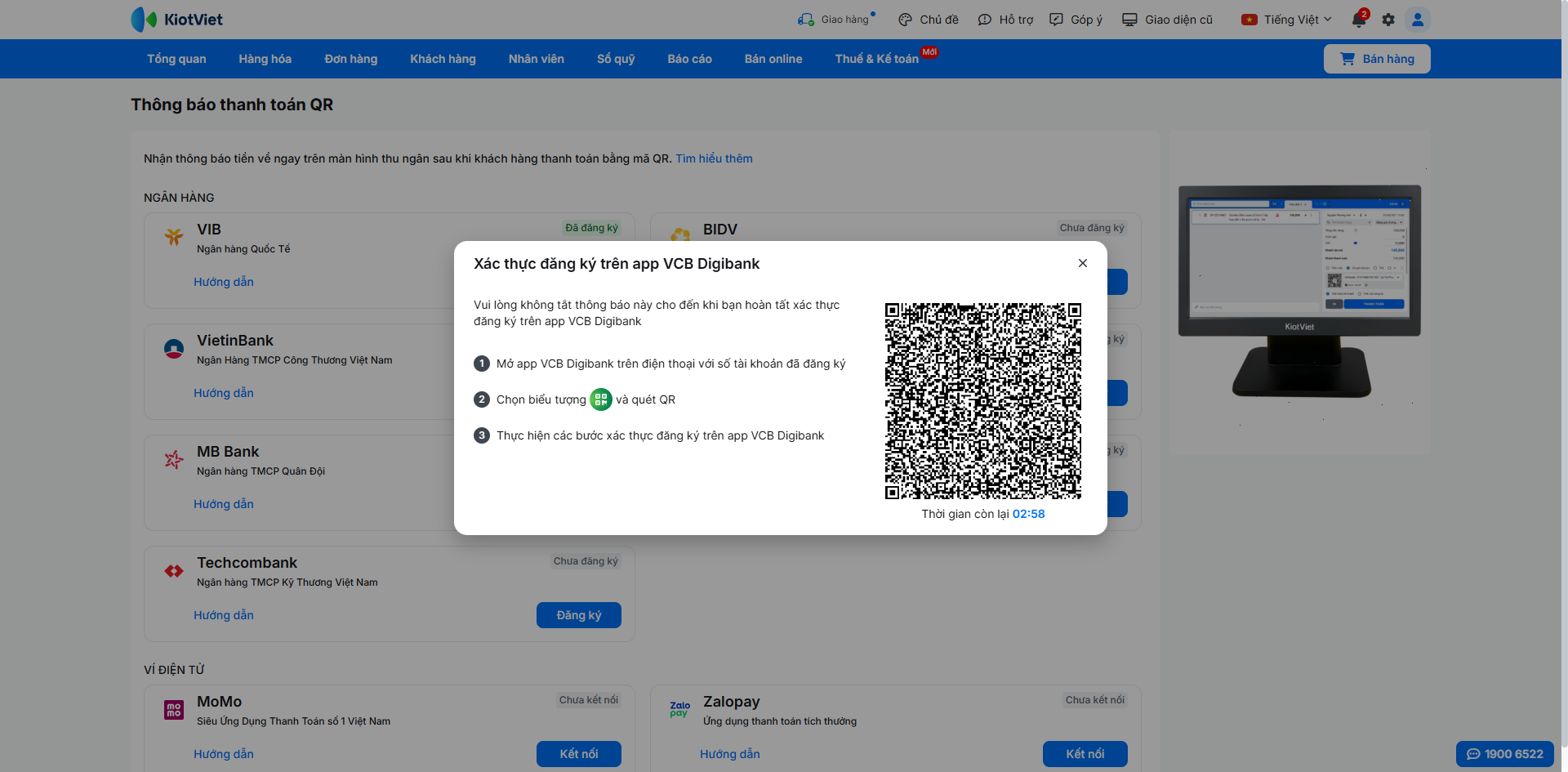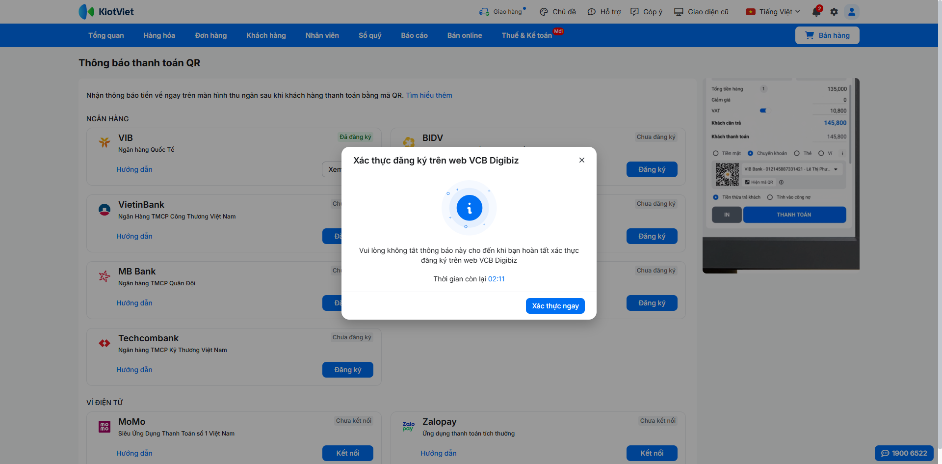Để kích hoạt tính năng nhận thông báo thanh toán tự động, bạn cần hoàn tất việc đăng ký dịch vụ trên KiotViet và xác thực liên kết trên nền tảng của Vietcombank.