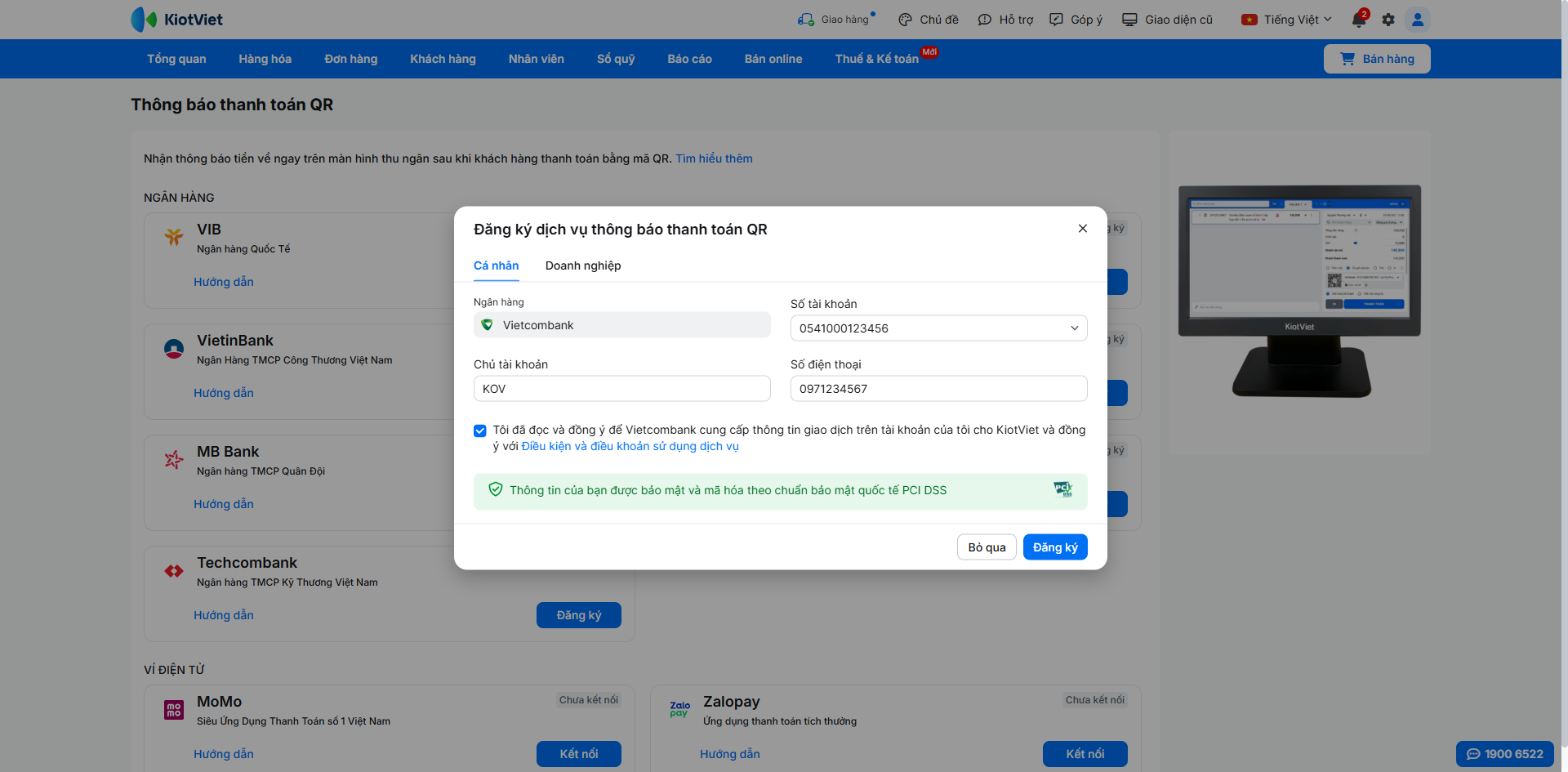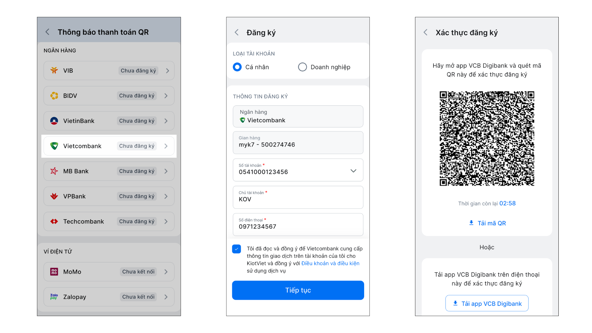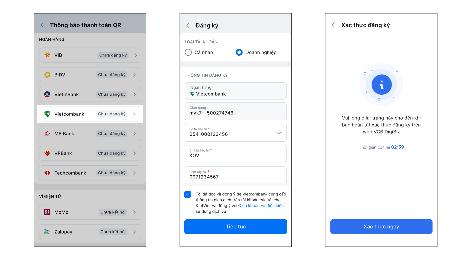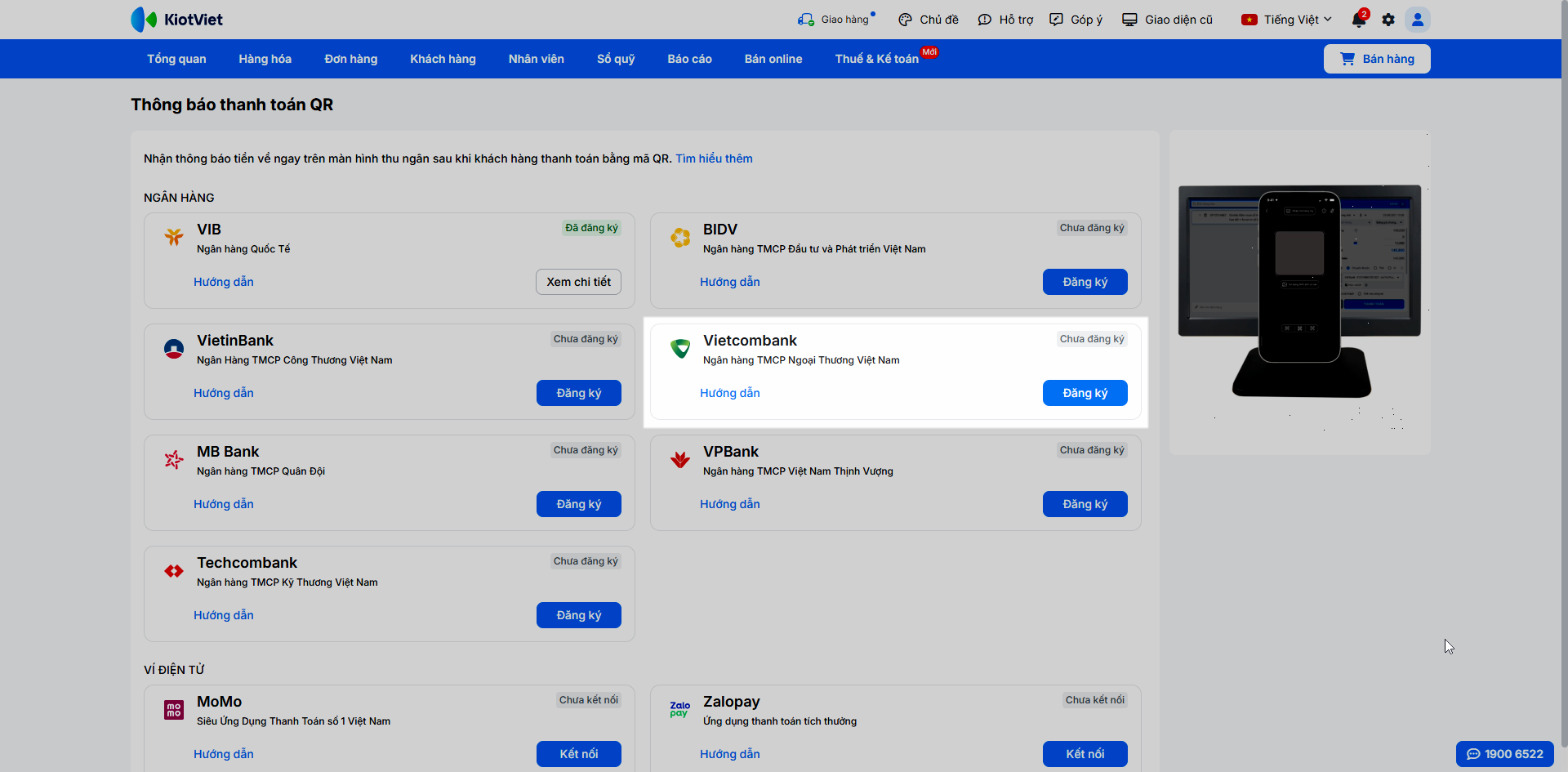 Để kích hoạt tính năng nhận thông báo thanh toán tự động, bạn cần hoàn tất việc đăng ký dịch vụ trên KiotViet và xác thực liên kết trên nền tảng của Vietcombank.