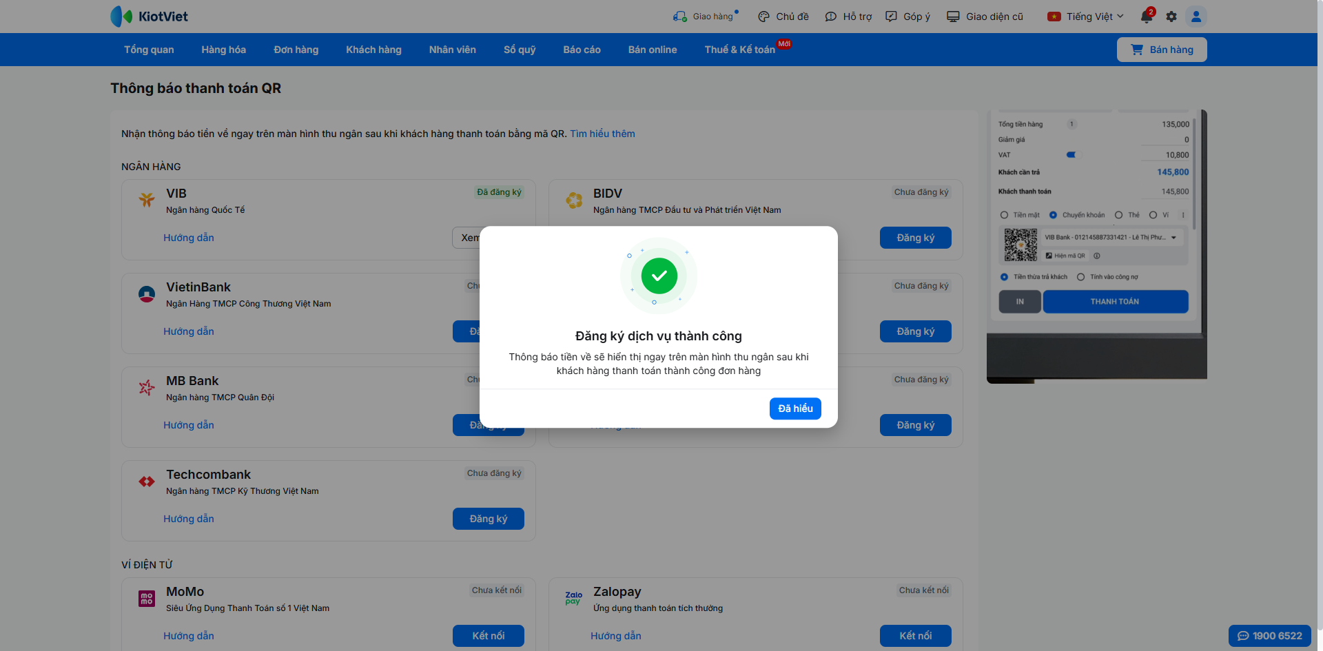 – Sau khi thành công, hệ thống KiotViet sẽ hiển thị thông báo dịch vụ đã được kích hoạt. Bạn nhấn Đã hiểu