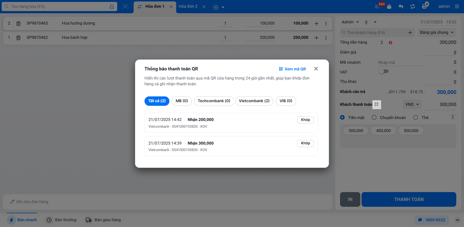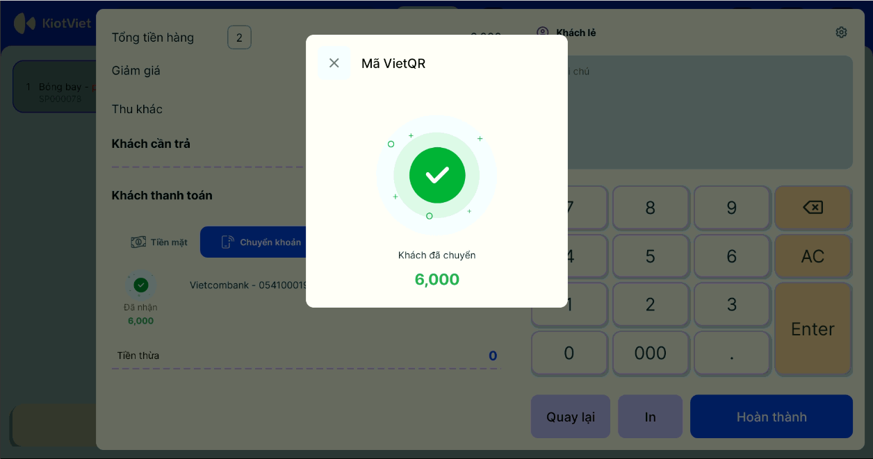 - Sau khi khách hàng quét mã và chuyển khoản thành công, màn hình Bán hàng sẽ ngay lập tức hiển thị thông báo kết quả giao dịch.