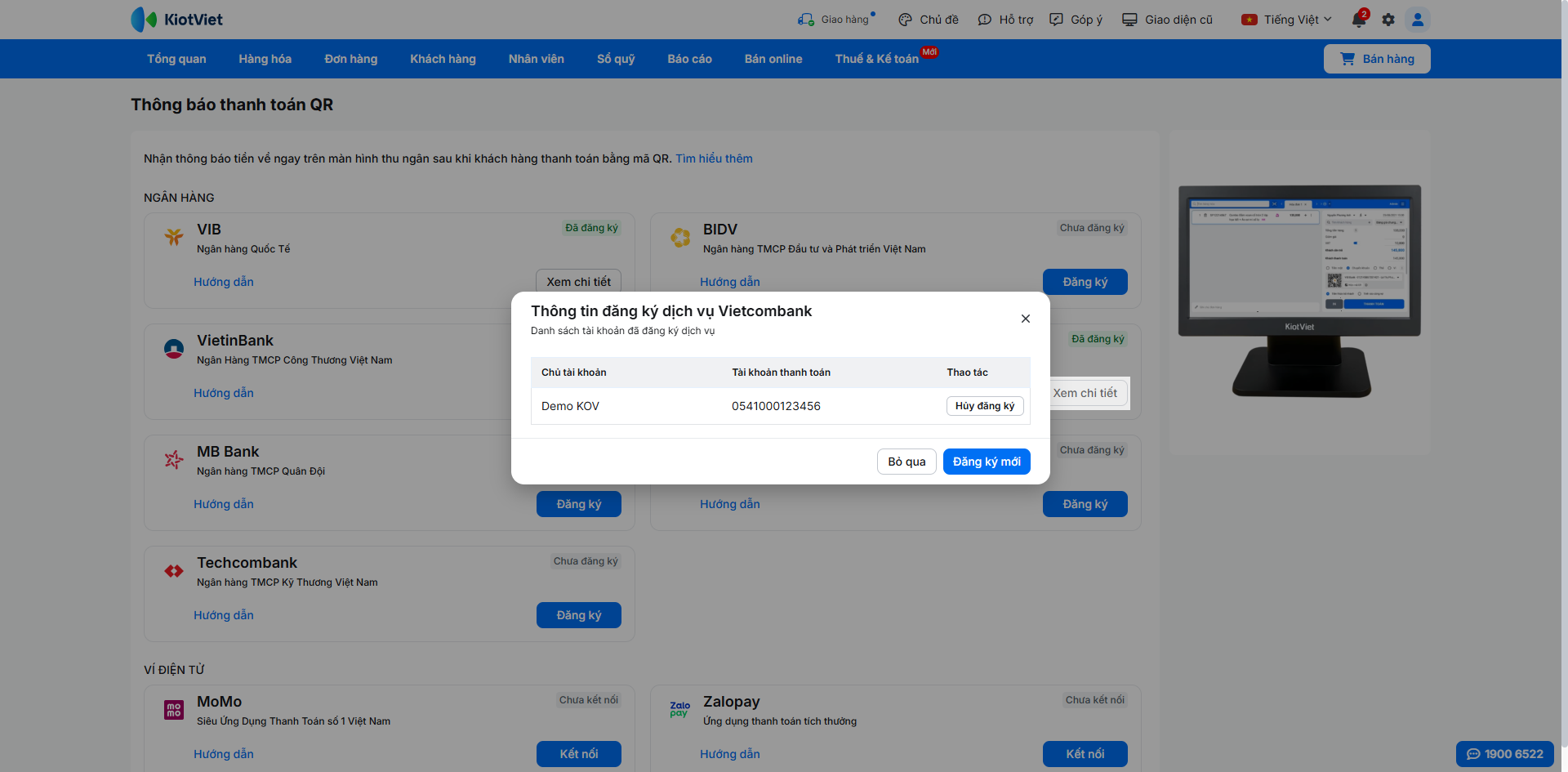 - Một gian hàng KiotViet có thể liên kết với nhiều tài khoản Vietcombank.