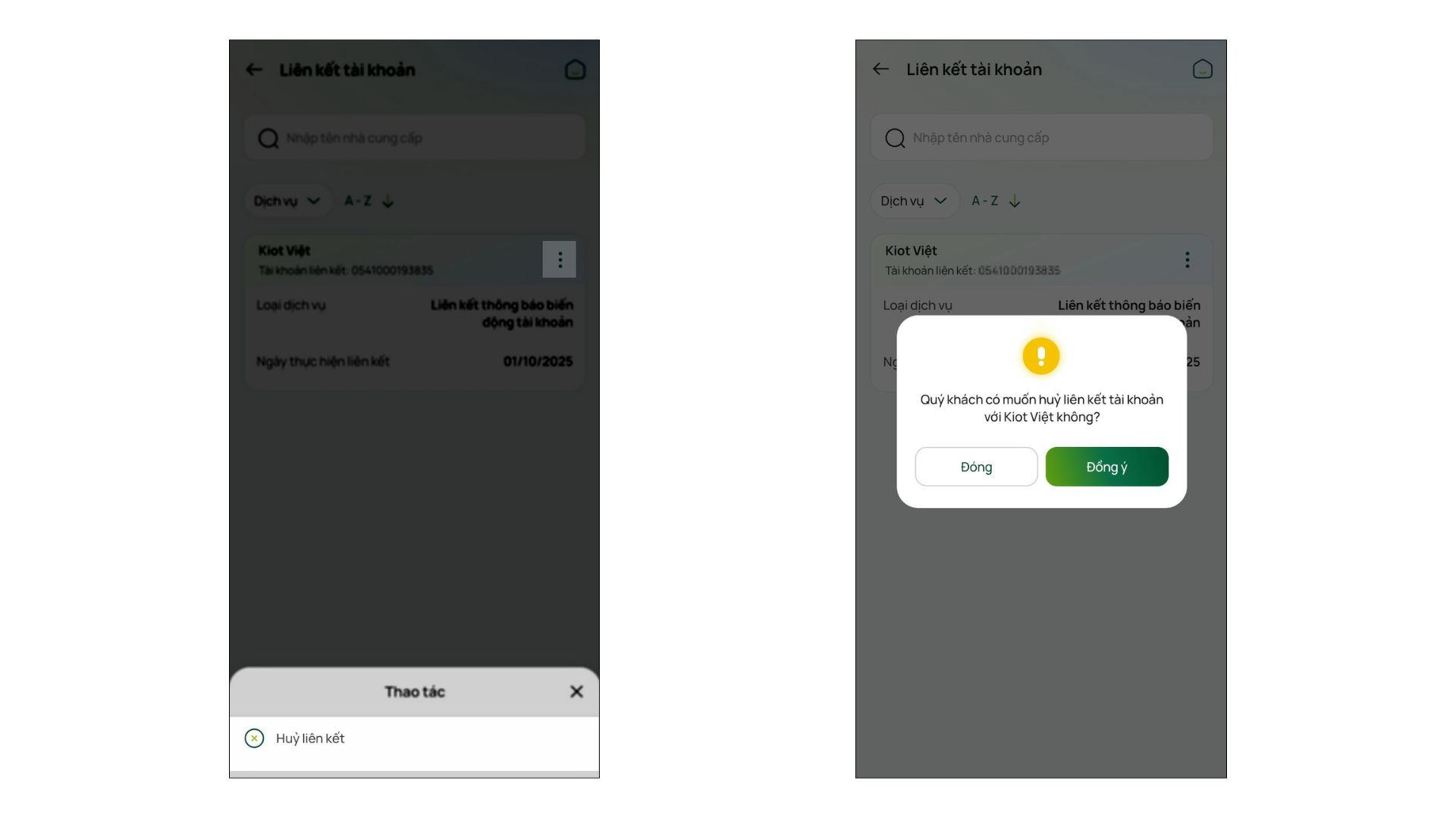 - Chọn dịch vụ Liên kết thông báo biến động tài khoản, chọn tài khoản KIOTVIET và nhấn 3 chấm → Hủy liên kết.