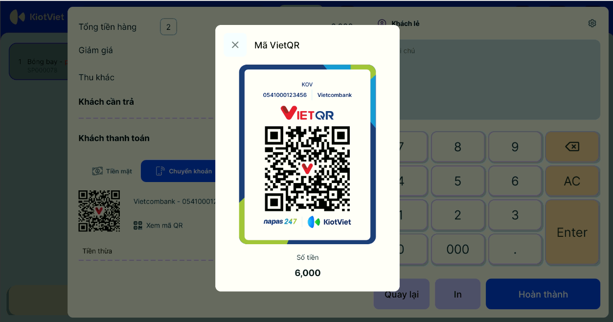 Nhằm hỗ trợ các gian hàng thúc đẩy việc thanh toán phi tiền mặt, KiotViet kết hợp cùng ngân hàng Vietcombank đã ra mắt tính năng thanh toán chuyển khoản bằng phương pháp quét mã VietQR và nhận thông báo kết quả ngay trên phần mềm.
