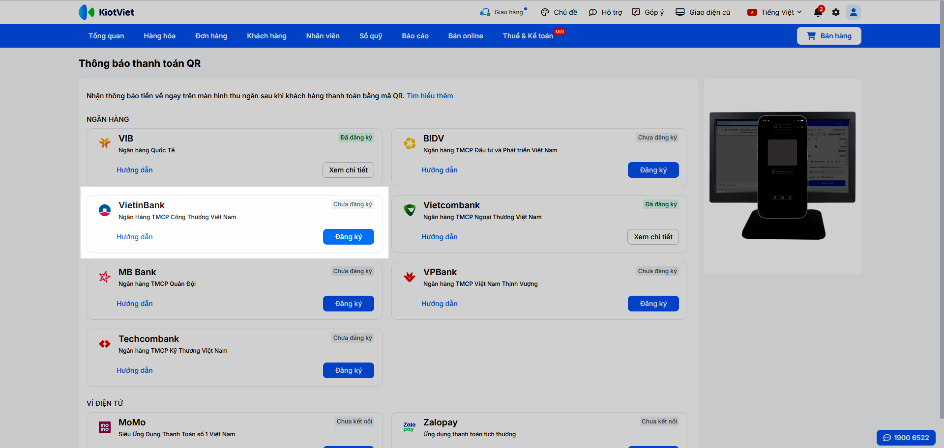 Nhằm hỗ trợ các gian hàng thúc đẩy việc thanh toán phi tiền mặt, KiotViet kết hợp cùng ngân hàng VietinBank đã ra mắt tính năng thanh toán chuyển khoản bằng phương pháp quét mã VietQR và nhận thông báo kết quả ngay trên phần mềm.