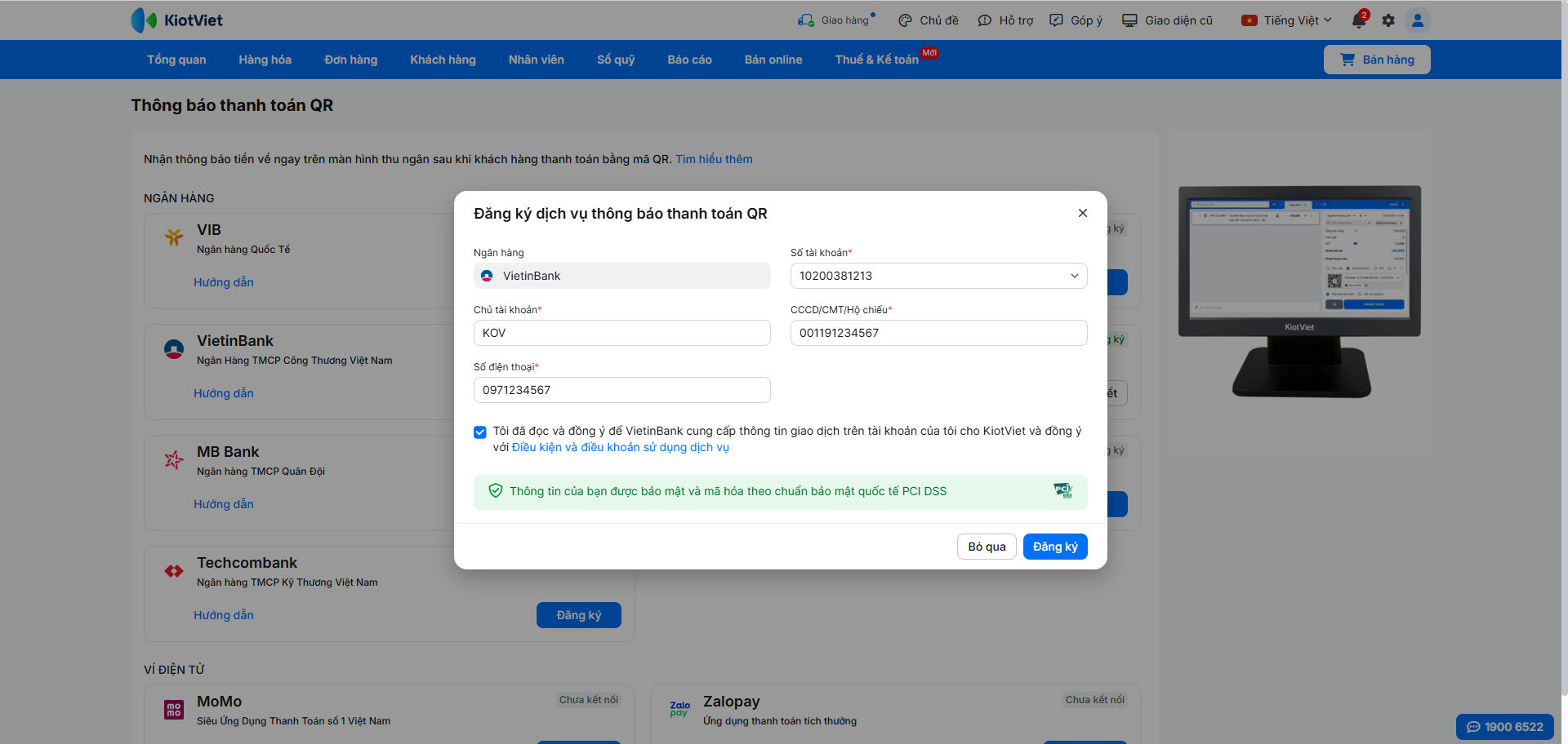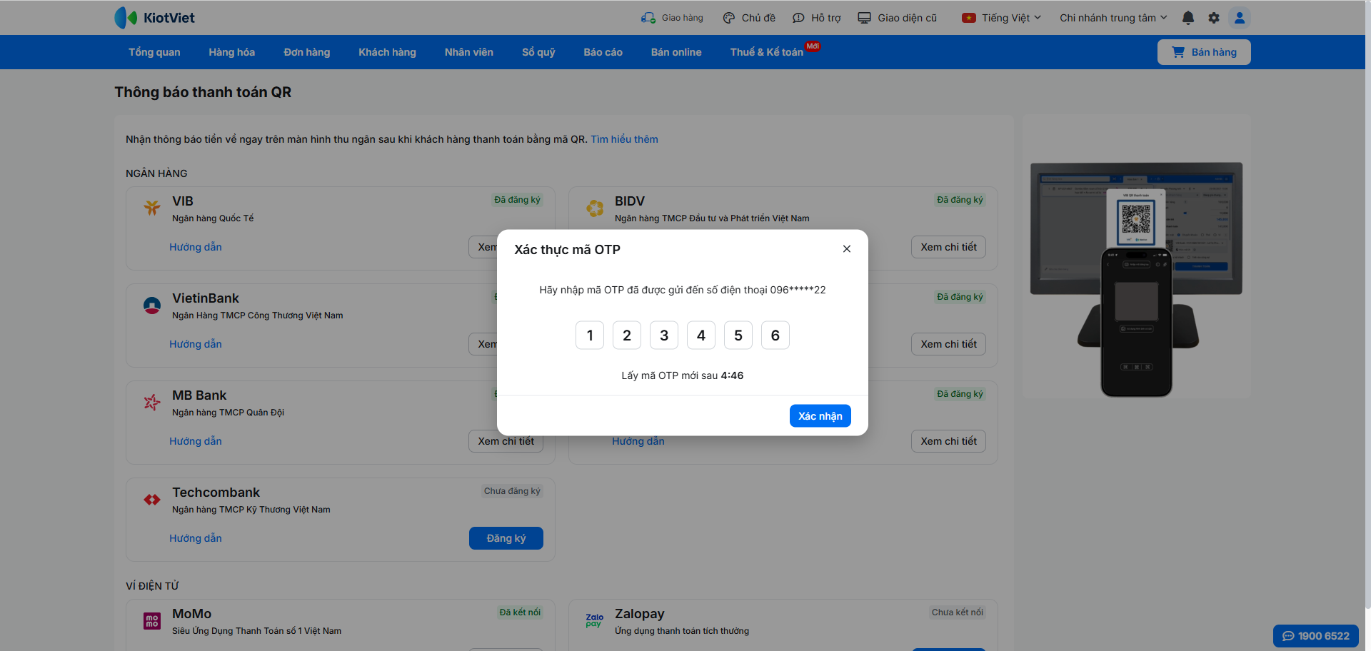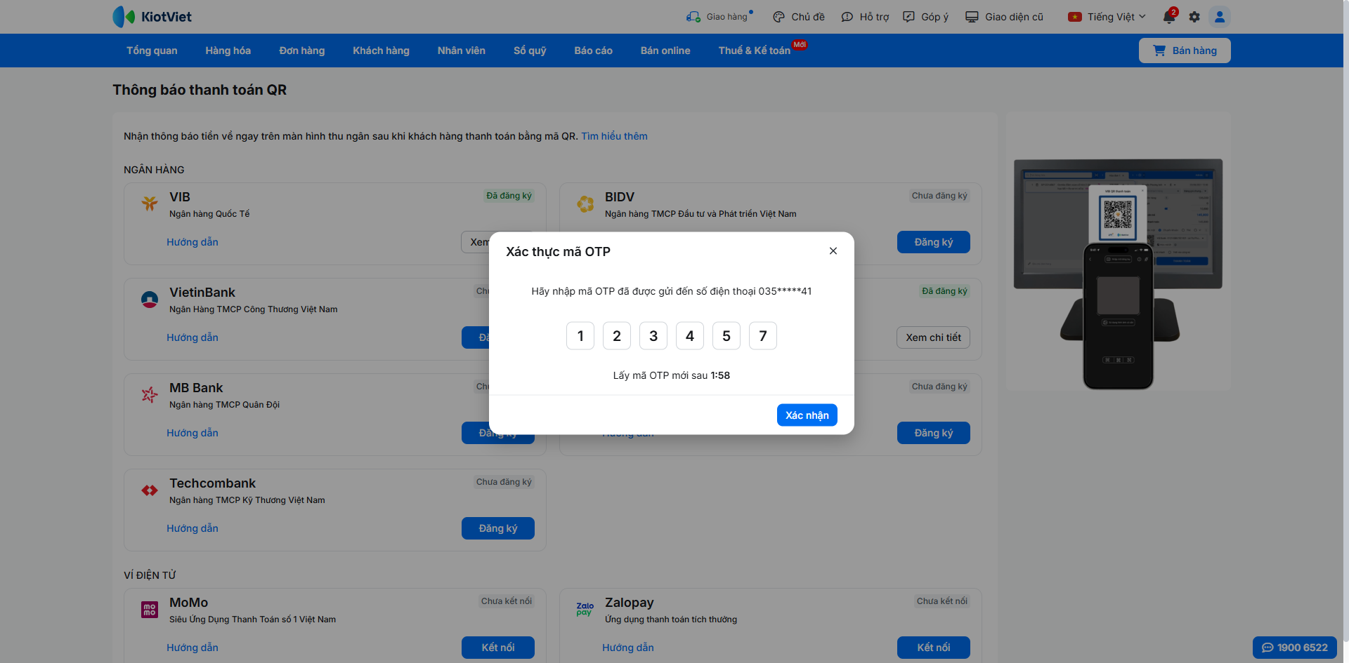 Để kích hoạt tính năng nhận thông báo thanh toán tự động, bạn cần đăng ký dịch vụ trực tiếp trên phần mềm KiotViet và xác thực bằng mã OTP.