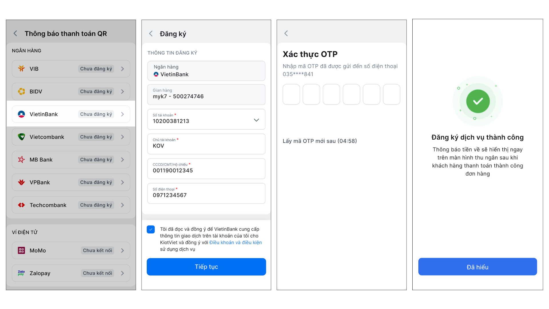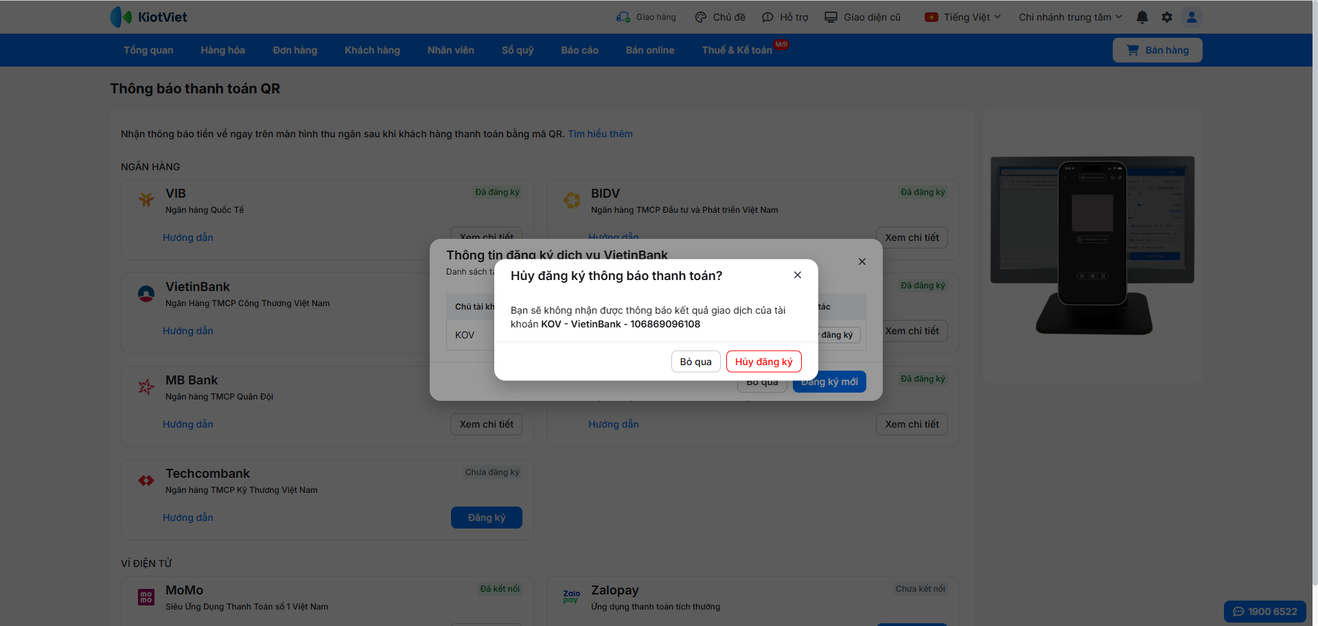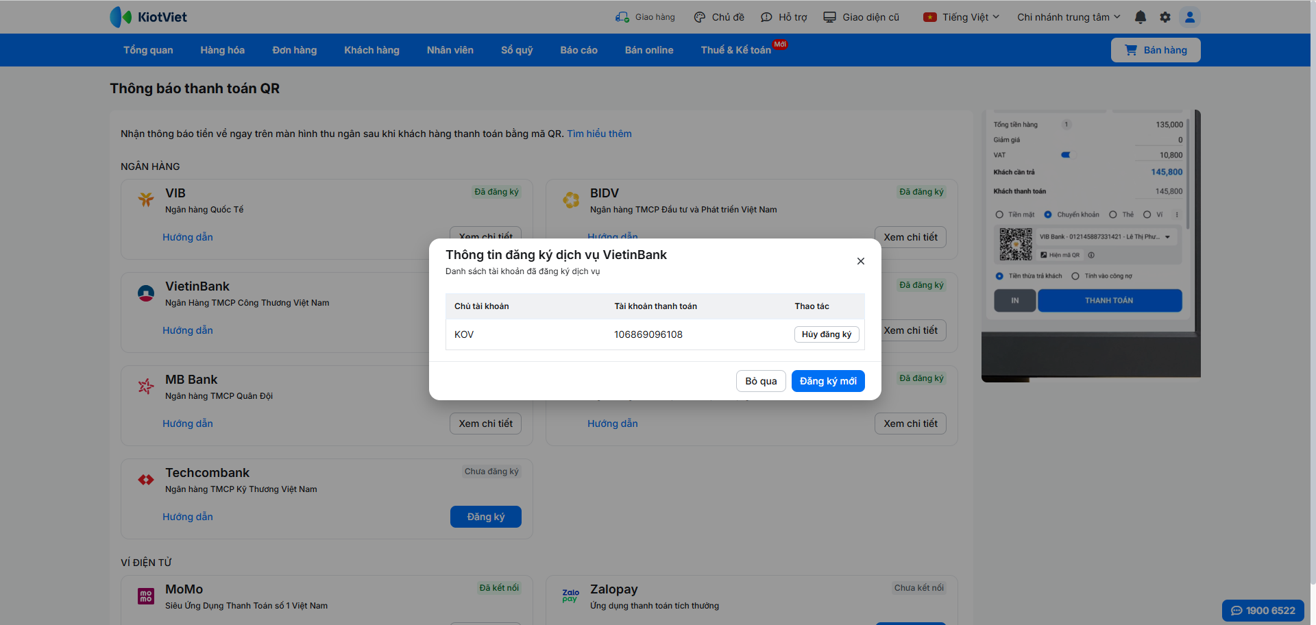 Để kích hoạt tính năng nhận thông báo thanh toán tự động, bạn cần đăng ký dịch vụ trực tiếp trên phần mềm KiotViet và xác thực bằng mã OTP.