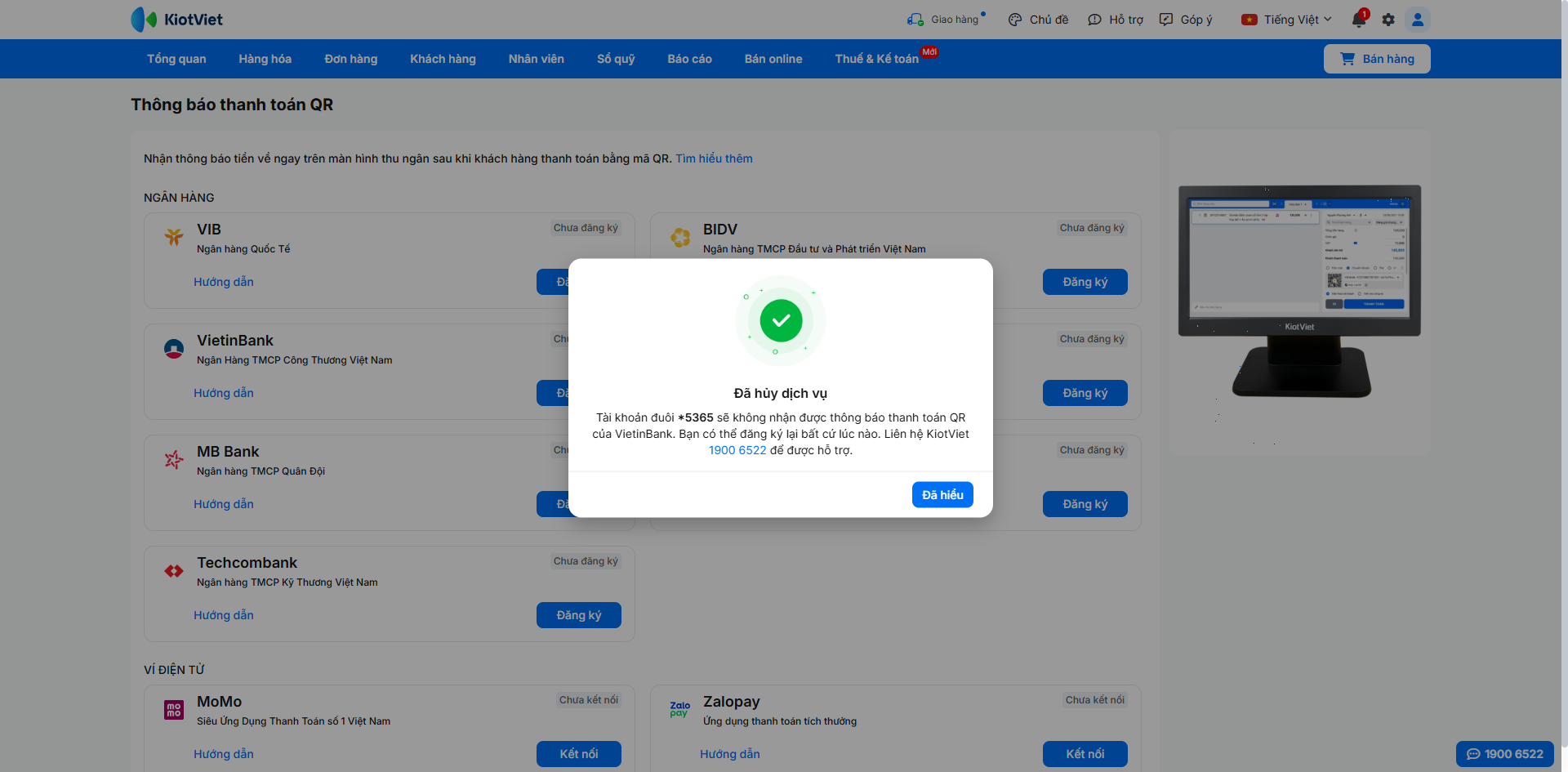 Khi khách hàng thực hiện thanh toán, hệ thống sẽ tự động hiển thị kết quả ngay trên màn hình Bán hàng để bạn xác nhận.