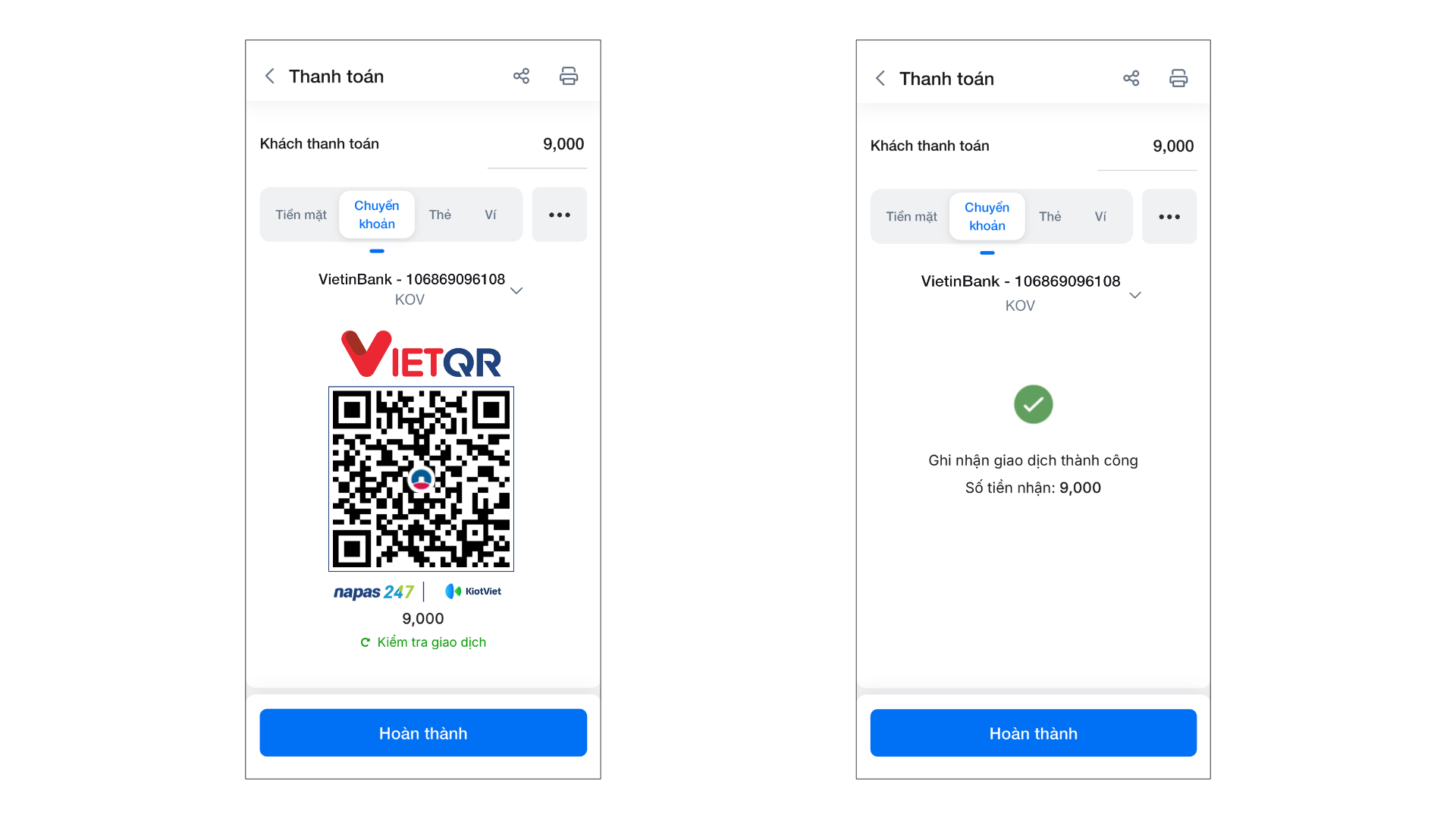 – Sau khi khách hàng quét mã và chuyển khoản thành công, màn hình Bán hàng sẽ ngay lập tức hiển thị thông báo kết quả giao dịch.