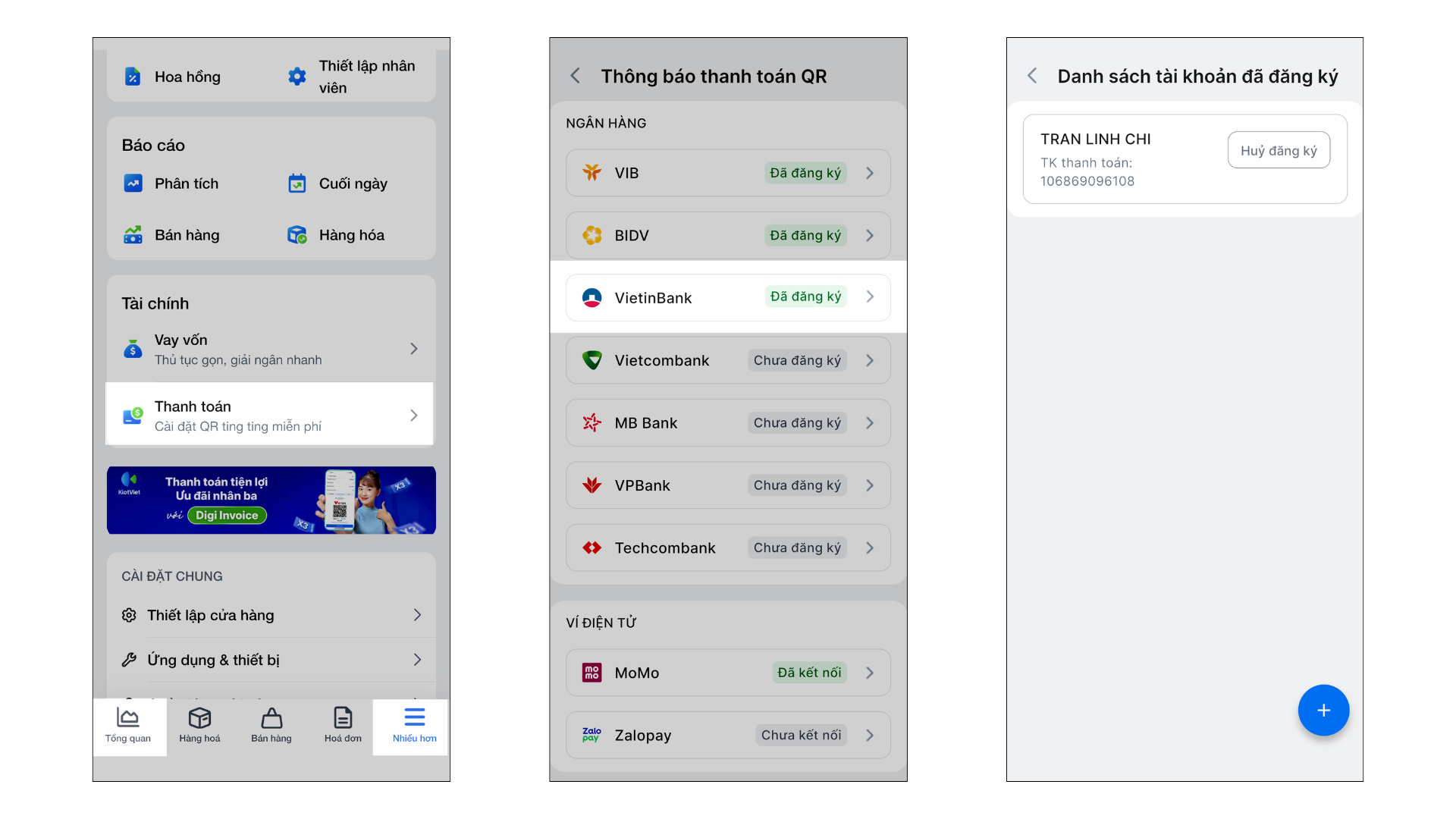 - Một gian hàng KiotViet có thể liên kết với nhiều tài khoản VietinBank.
