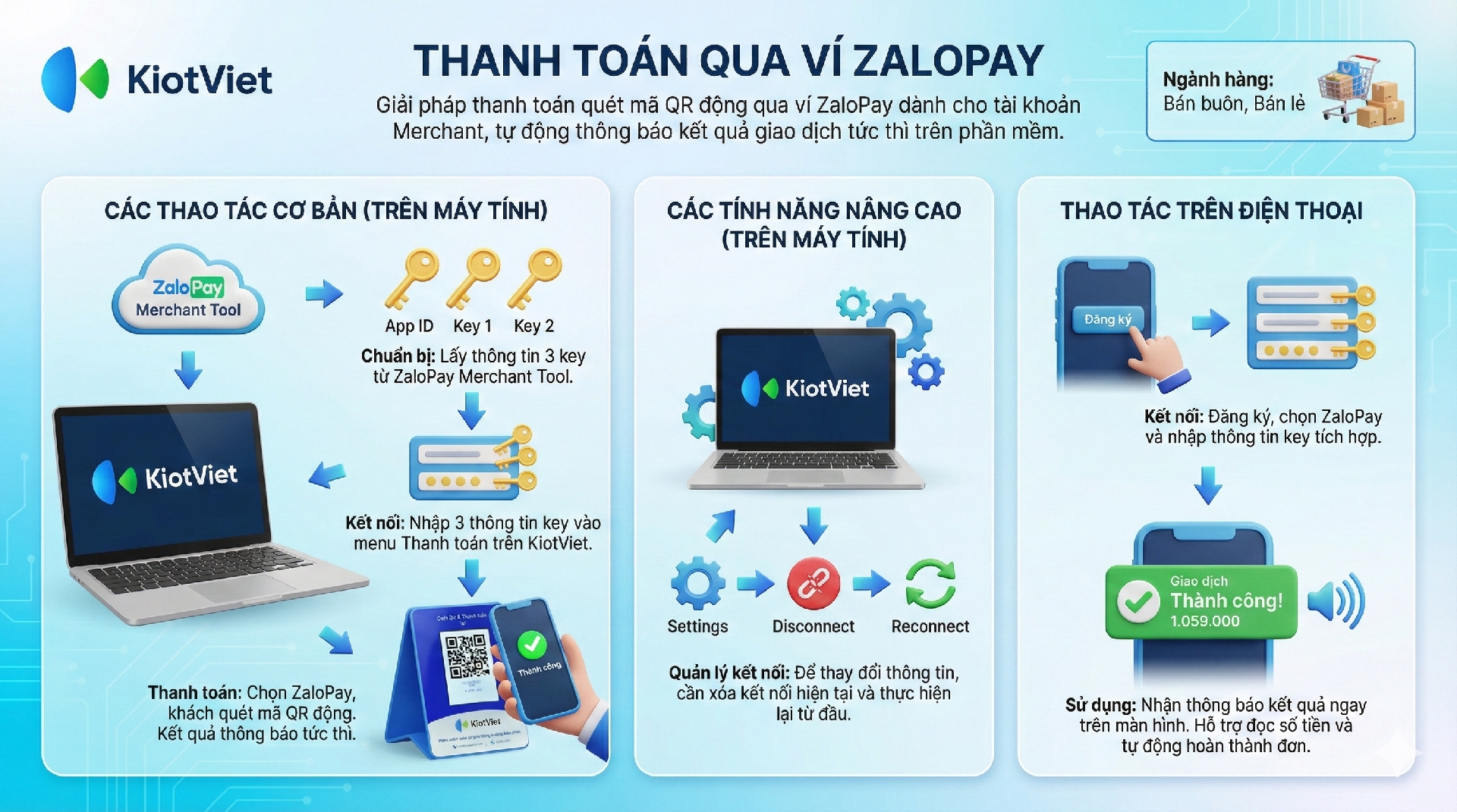 Để kích hoạt tính năng, bạn cần lấy thông tin từ tài khoản ZaloPay Merchant và điền vào phần thiết lập trên KiotViet.