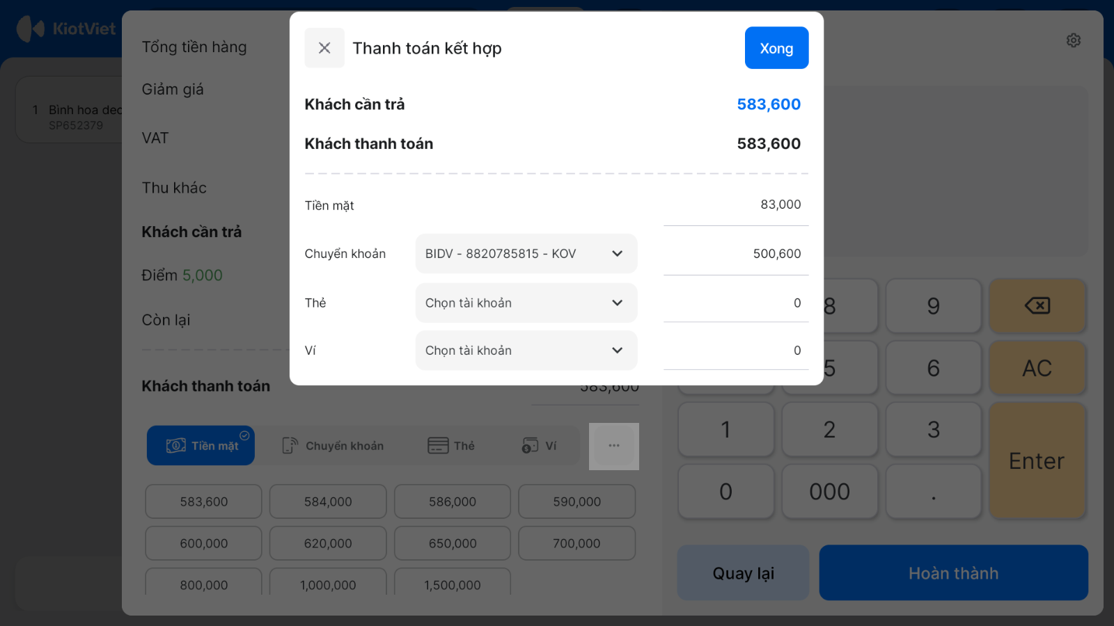 - Trong cửa sổ hiện ra, nhập số tiền khách trả và chọn nhanh các phương thức.