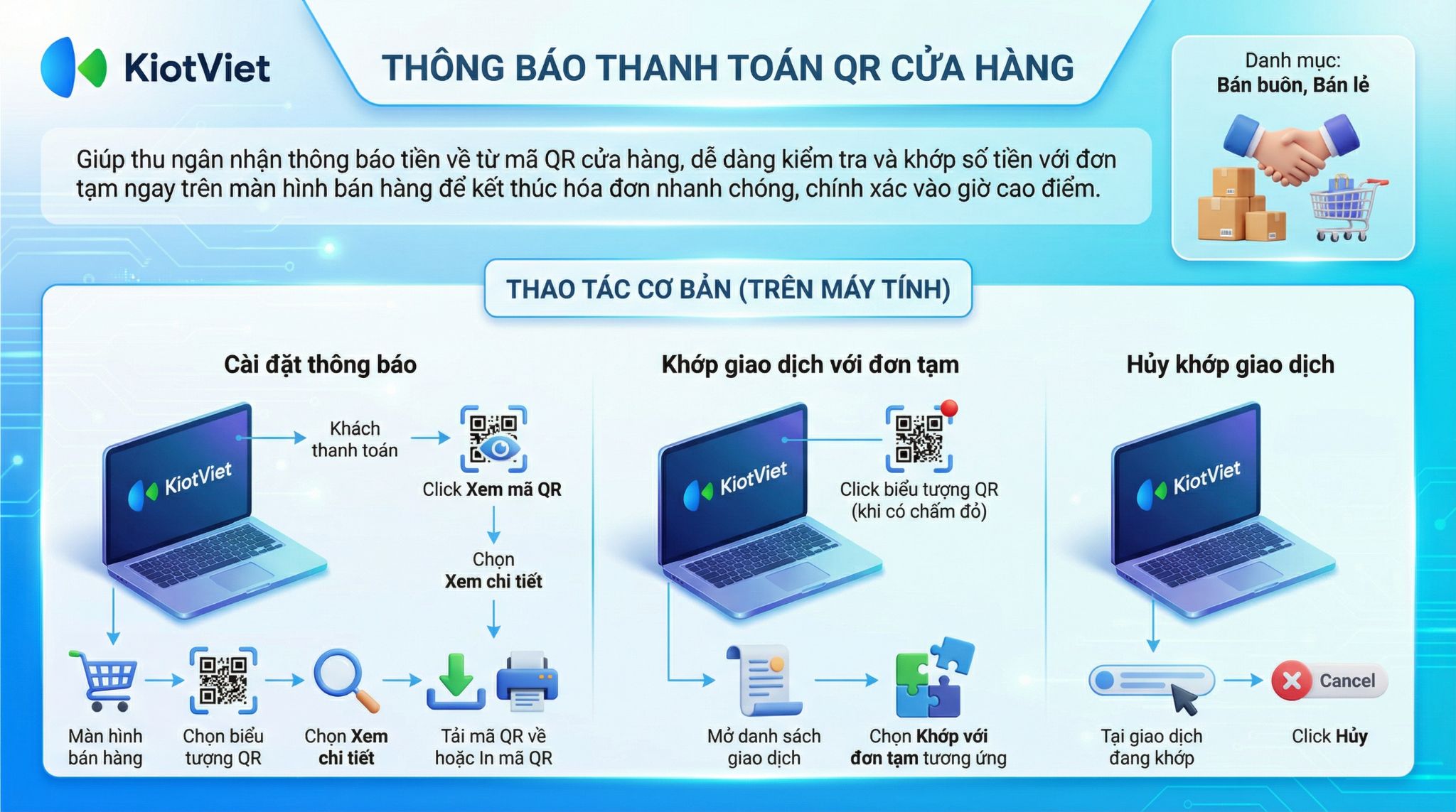 Trước đây, để đối chiếu thanh toán, thu ngân phải tra cứu từng giao dịch chuyển khoản trên ứng dụng ngân hàng và ghi nhớ hoặc đối chiếu thủ công. Việc này mất thời gian và dễ sai sót. Tính năng Thông báo thanh toán QR cửa hàng ra đời nhằm hỗ trợ tối đa cho quy trình này. Khi khách quét mã QR và chuyển khoản vào các tài khoản ngân hàng đã liên kết dịch vụ nhận thông báo trên KiotViet sẽ: