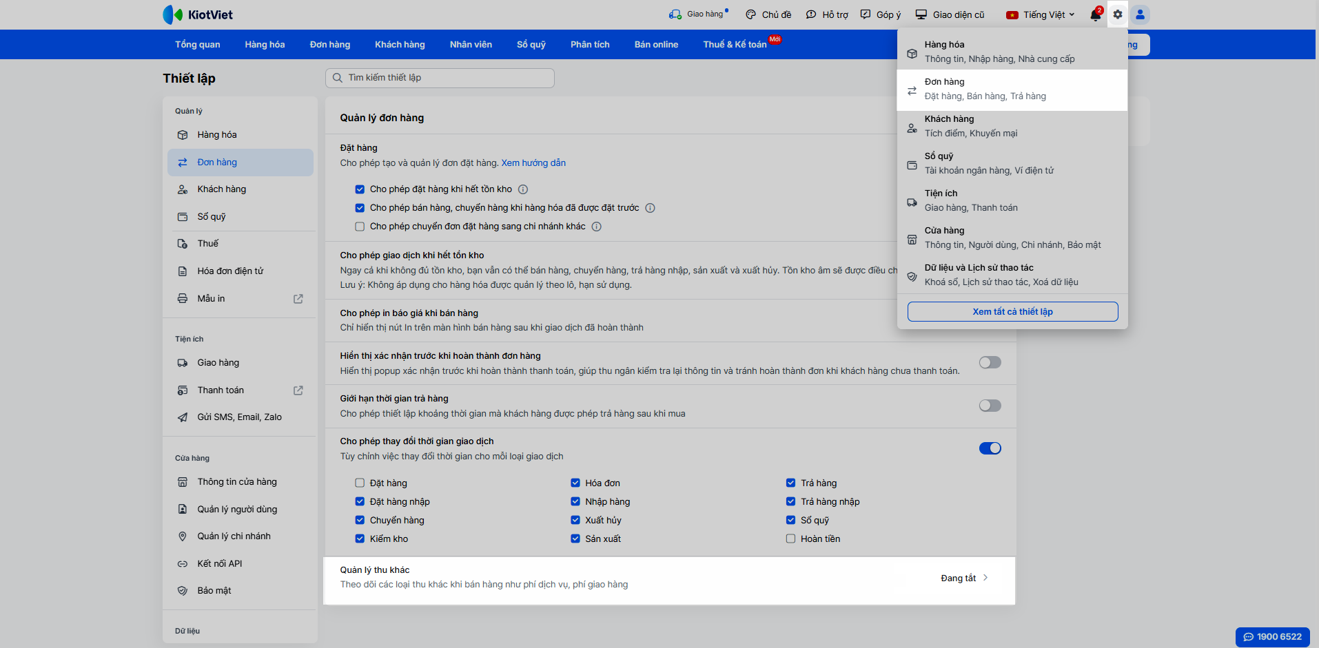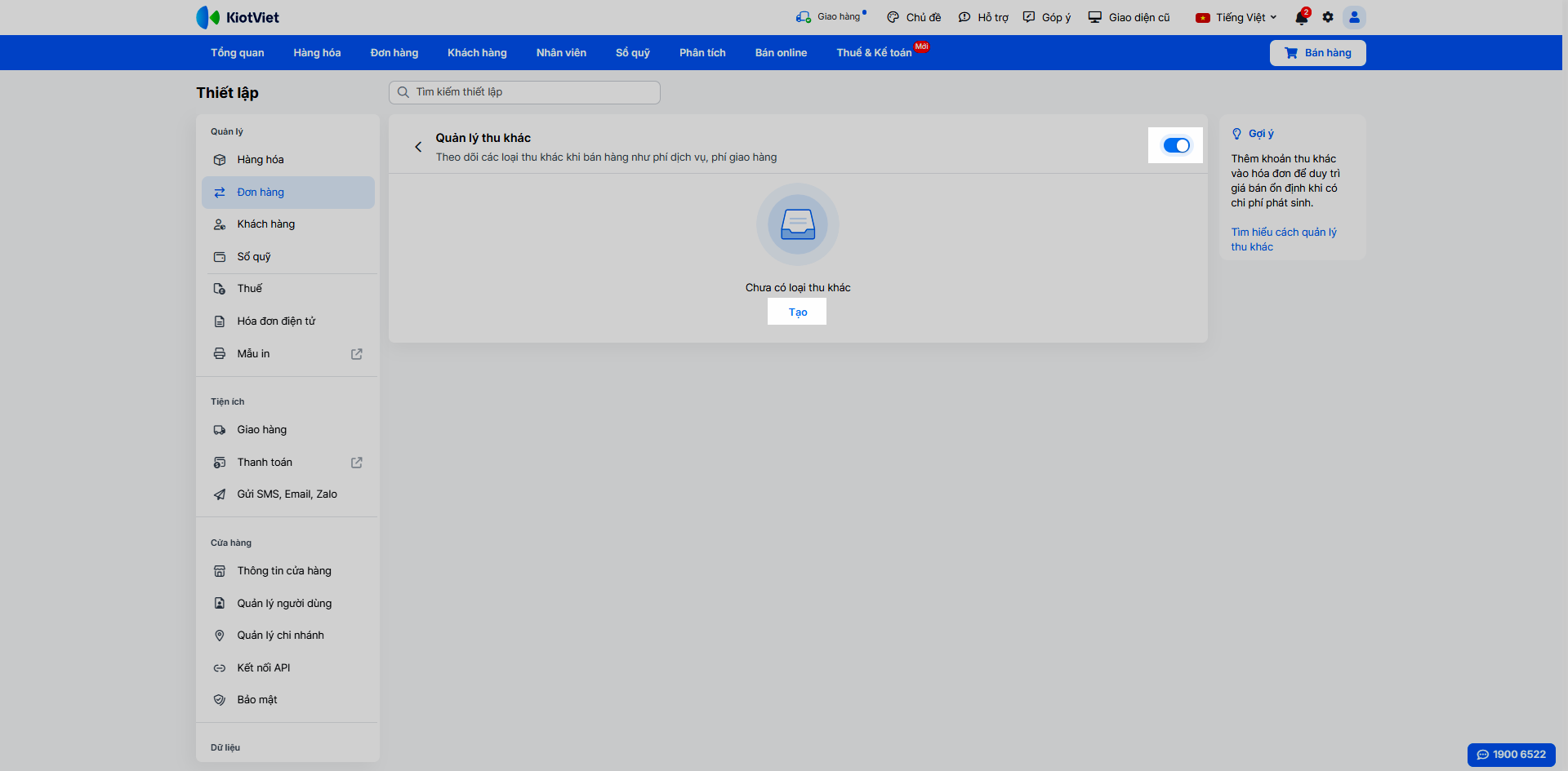 - Đầu tiên, bạn cần kích hoạt tính năng. Tại màn hình Quản lý, vào Thiết lập → Đơn hàng → trên dòng Quản lý thu khác nhấn Đang tắt.