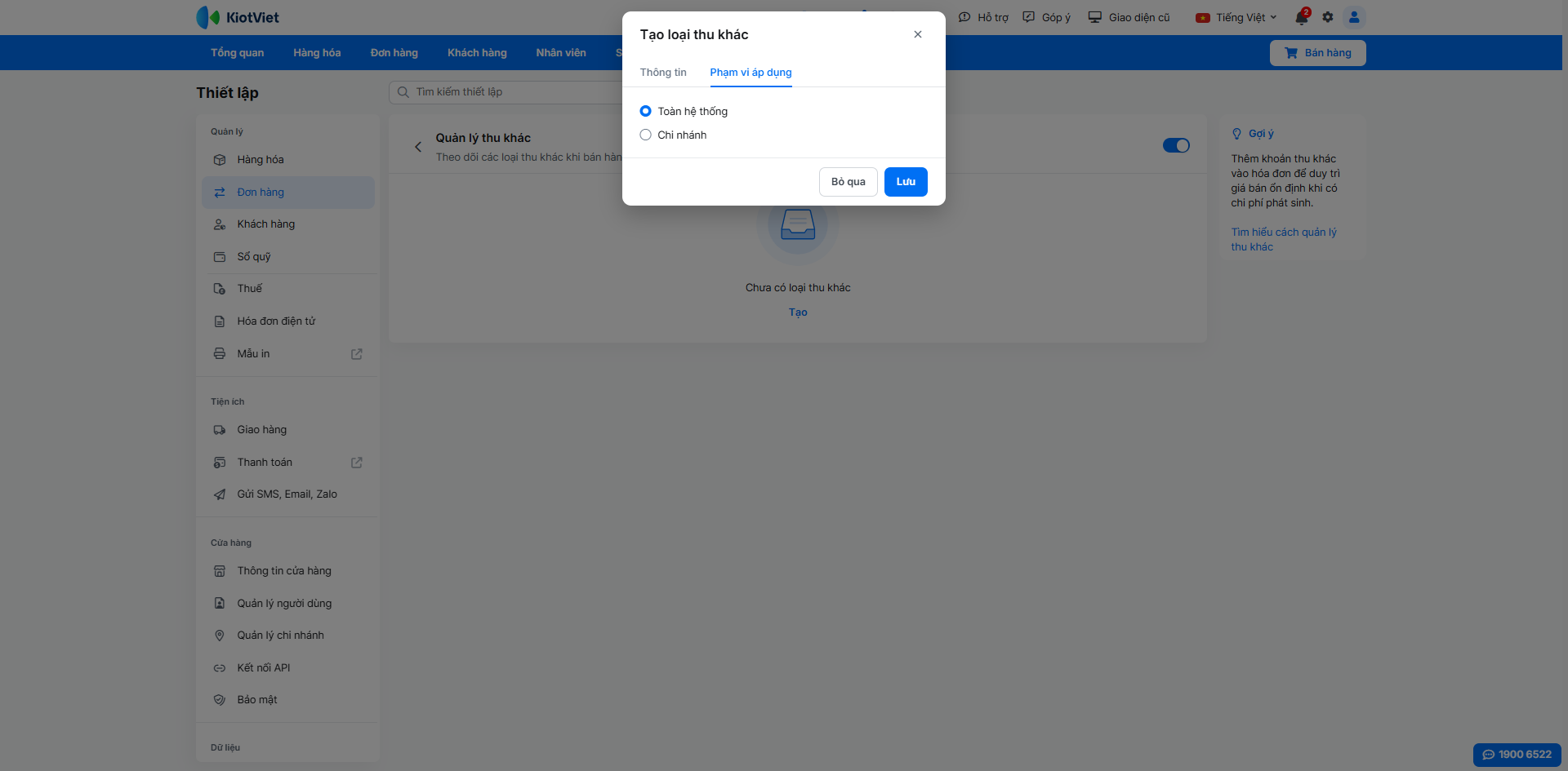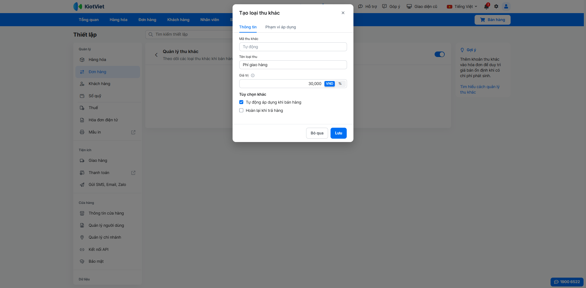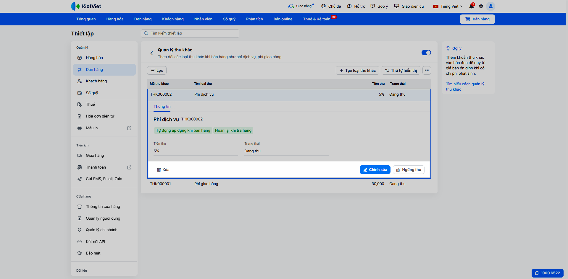 Tính năng Quản lý thu khác hỗ trợ cửa hàng quản lý các khoản chi phí phát sinh ngoài giá trị hàng hóa như: phí giao hàng, phí dịch vụ, VAT… Bạn có thể thiết lập các khoản thu này theo một số tiền cố định (VNĐ) hoặc phần trăm (%) giá trị đơn hàng.