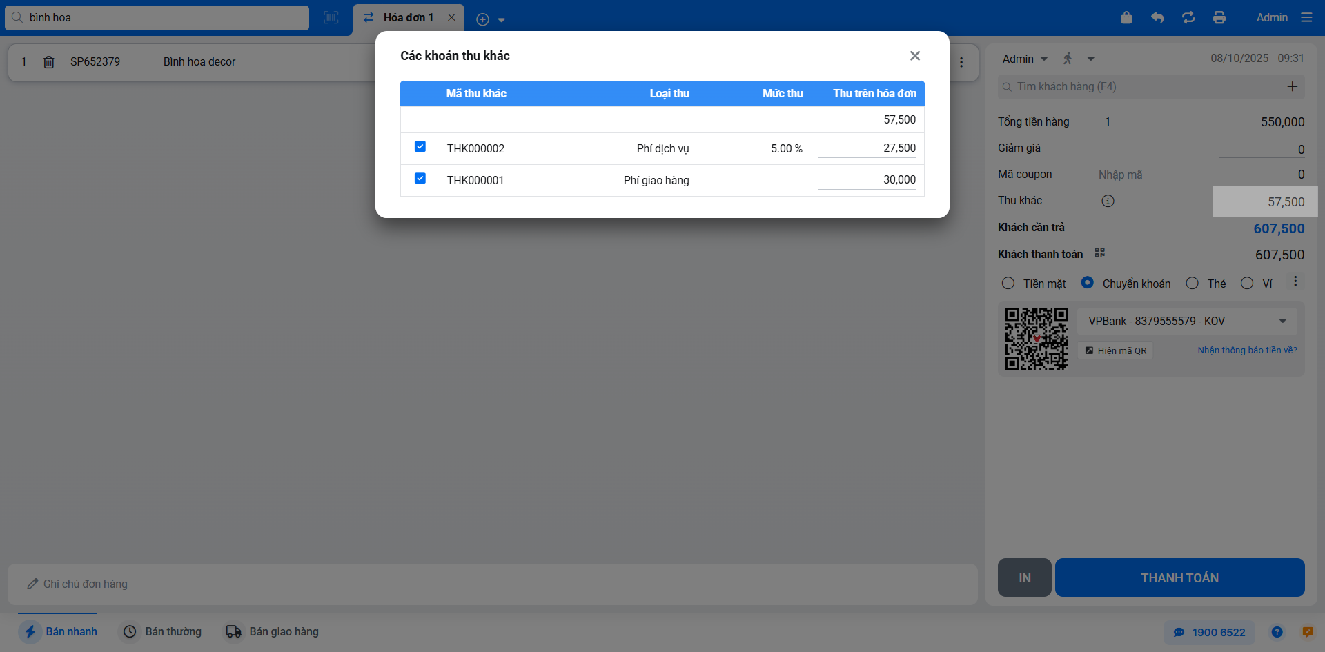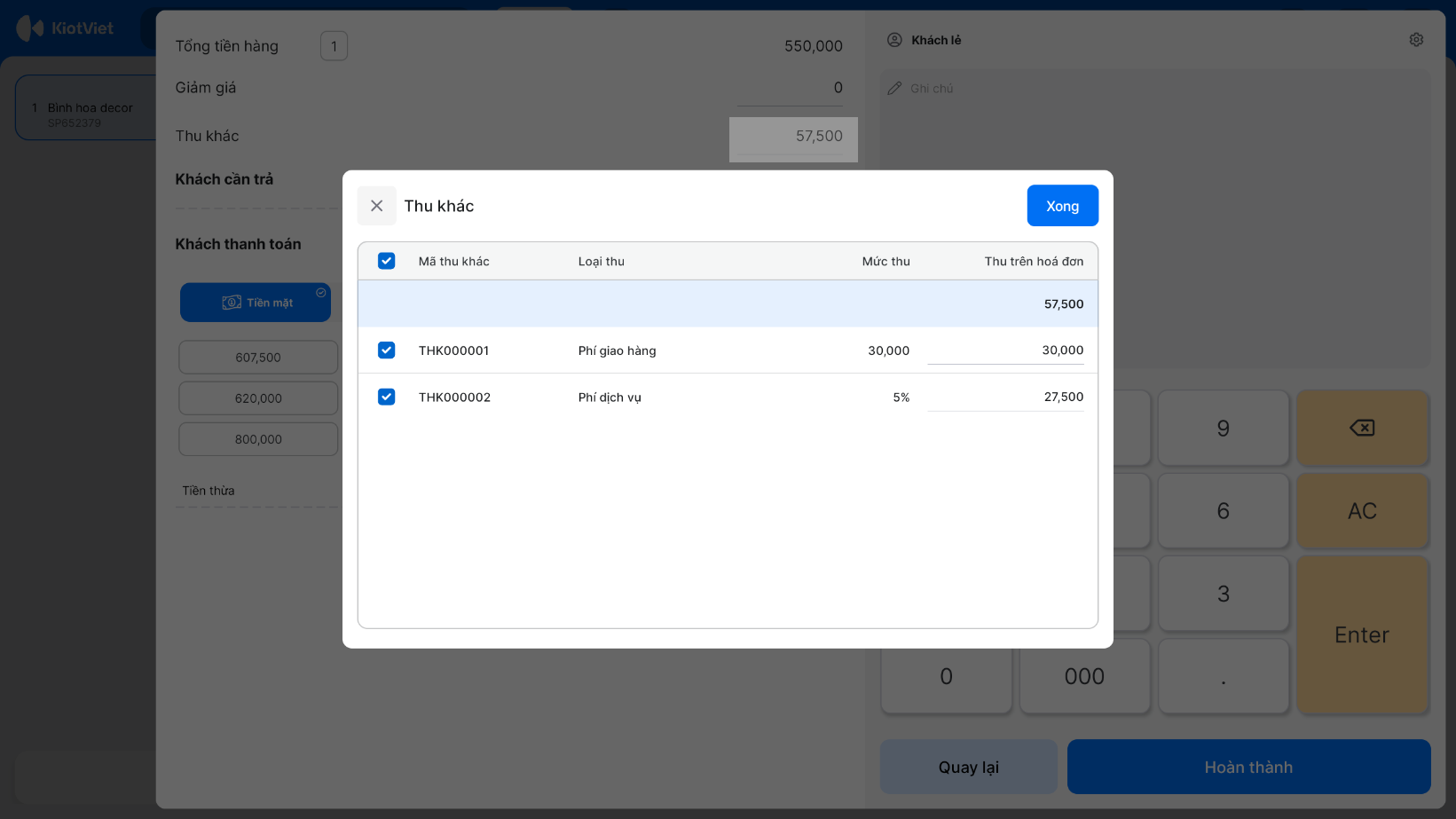 - Khi Thanh toán đơn hàng, ứng dụng tự động thêm các khoản thu khác được thiết lập Tự động đưa vào hóa đơn.