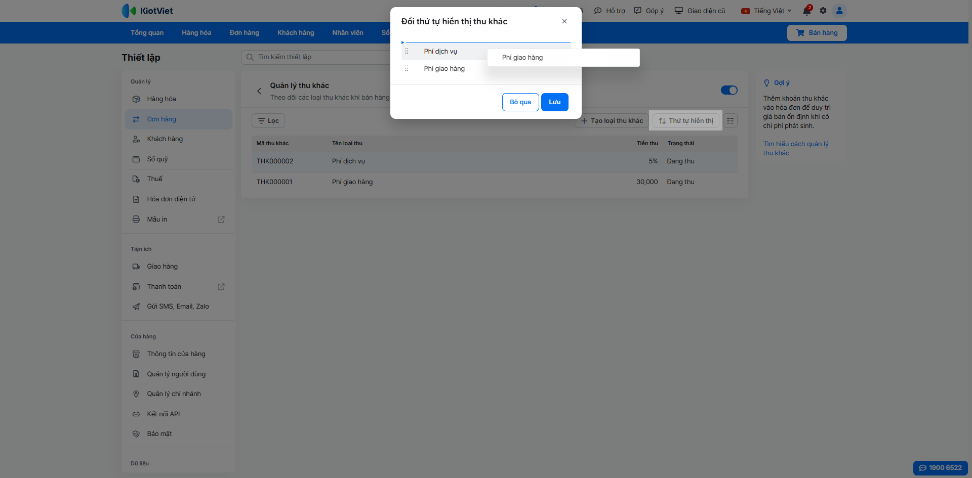 - Để thay đổi thứ tự, trên danh sách thu khác, bạn nhấn Thứ tự hiển thị → kéo thả thu khác để thay đổi vị trí → nhấn Lưu.