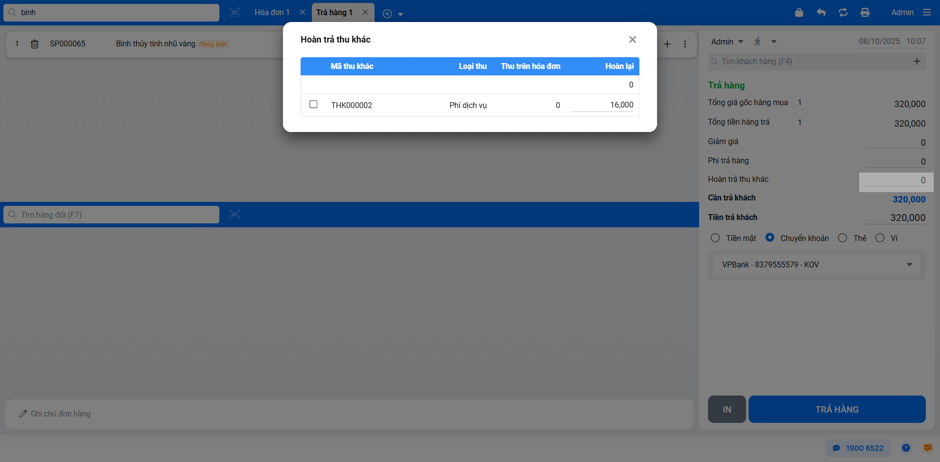 - Đối với trả hàng nhanh, bạn cần chủ động chọn các khoản thu khác cần hoàn lại.