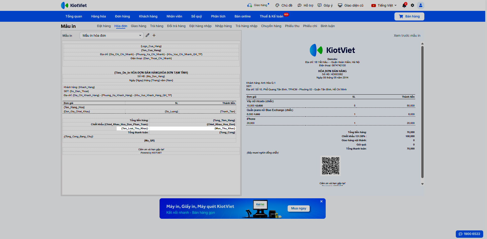 - Bạn vào Thiết lập → Xem tất cả thiết lập → Mẫu in và thêm các mã (token) tương ứng vào mẫu in cần hiển thị: