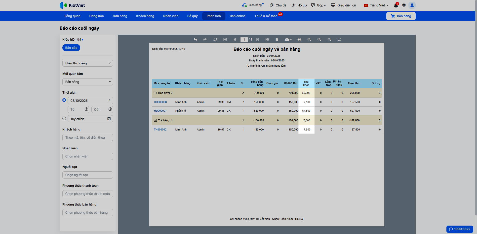 - Báo cáo cuối ngày: Bạn vào Phân tích → Báo cáo → Cuối ngày. Trong mối quan tâm Bán hàng, các khoản thu khác sẽ được ghi nhận.