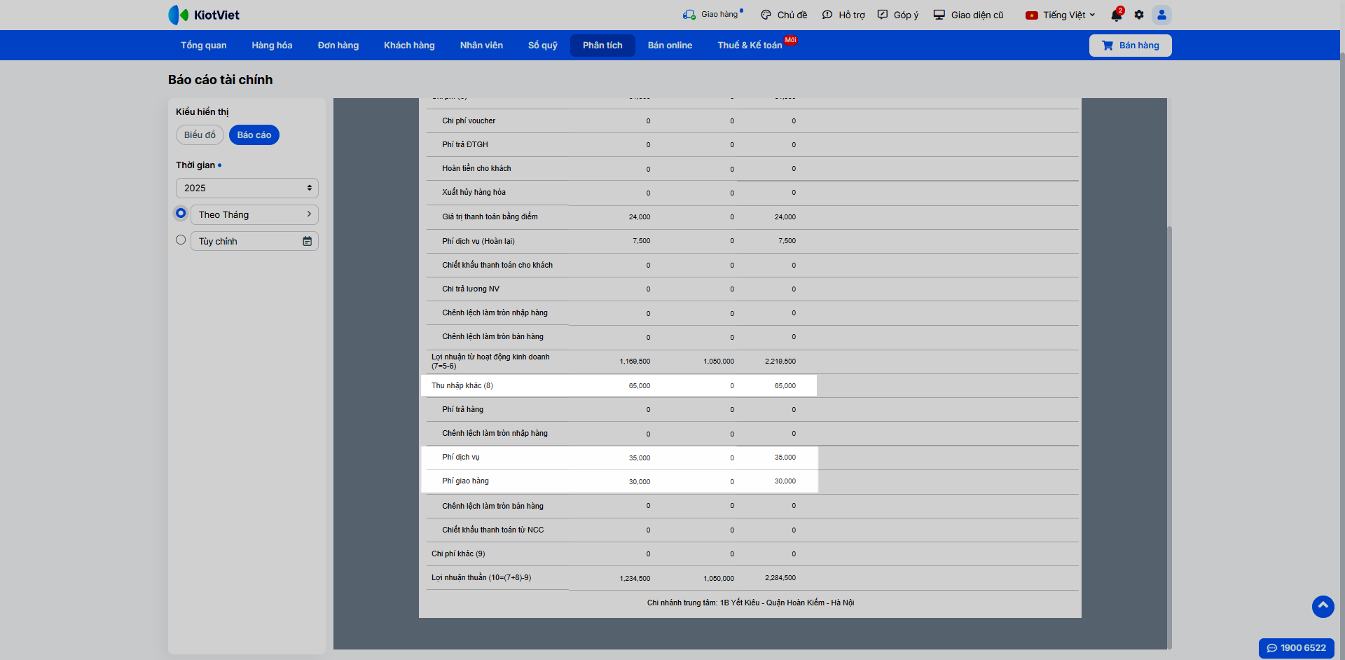 - Báo cáo tài chính: Bạn vào Phân tích → Báo cáo → Tài chính. Các khoản thu khác được tổng hợp trong mục Thu nhập khác.