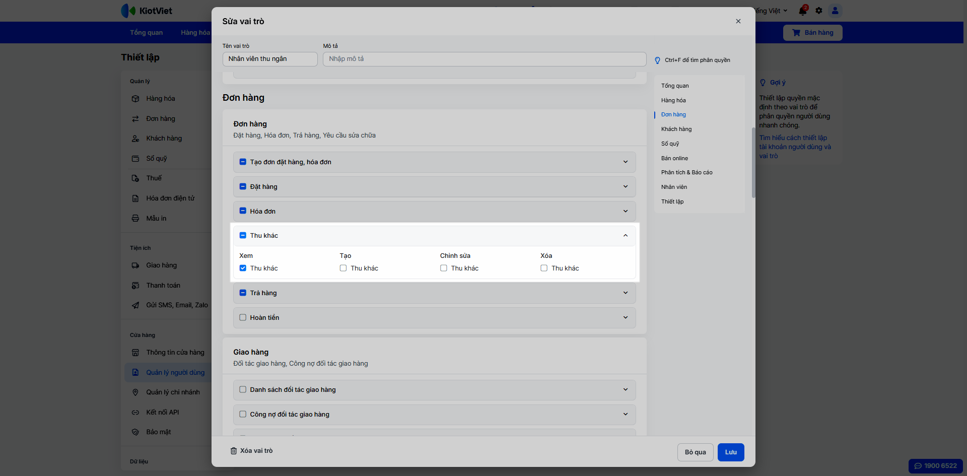 - Trong mục Đơn hàng → Thu khác, bạn chỉ cấp quyền Xem. Bỏ chọn các quyền Tạo, Chỉnh sửa và Xóa.