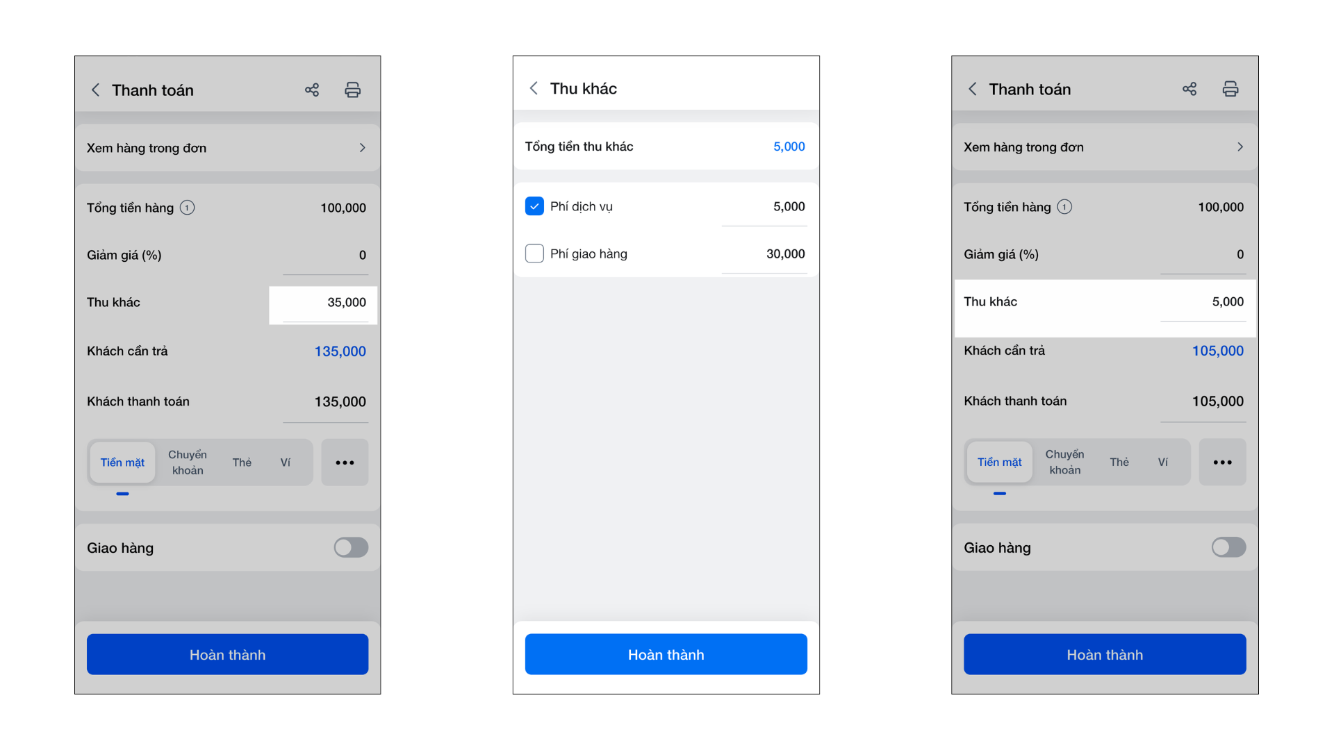 - Bạn chạm vào giá trị Thu khác để thêm/bớt các khoản thu, hoặc chỉnh sửa giá trị thu trực tiếp trên hóa đơn đó nếu cần → chọn Hoàn thành.