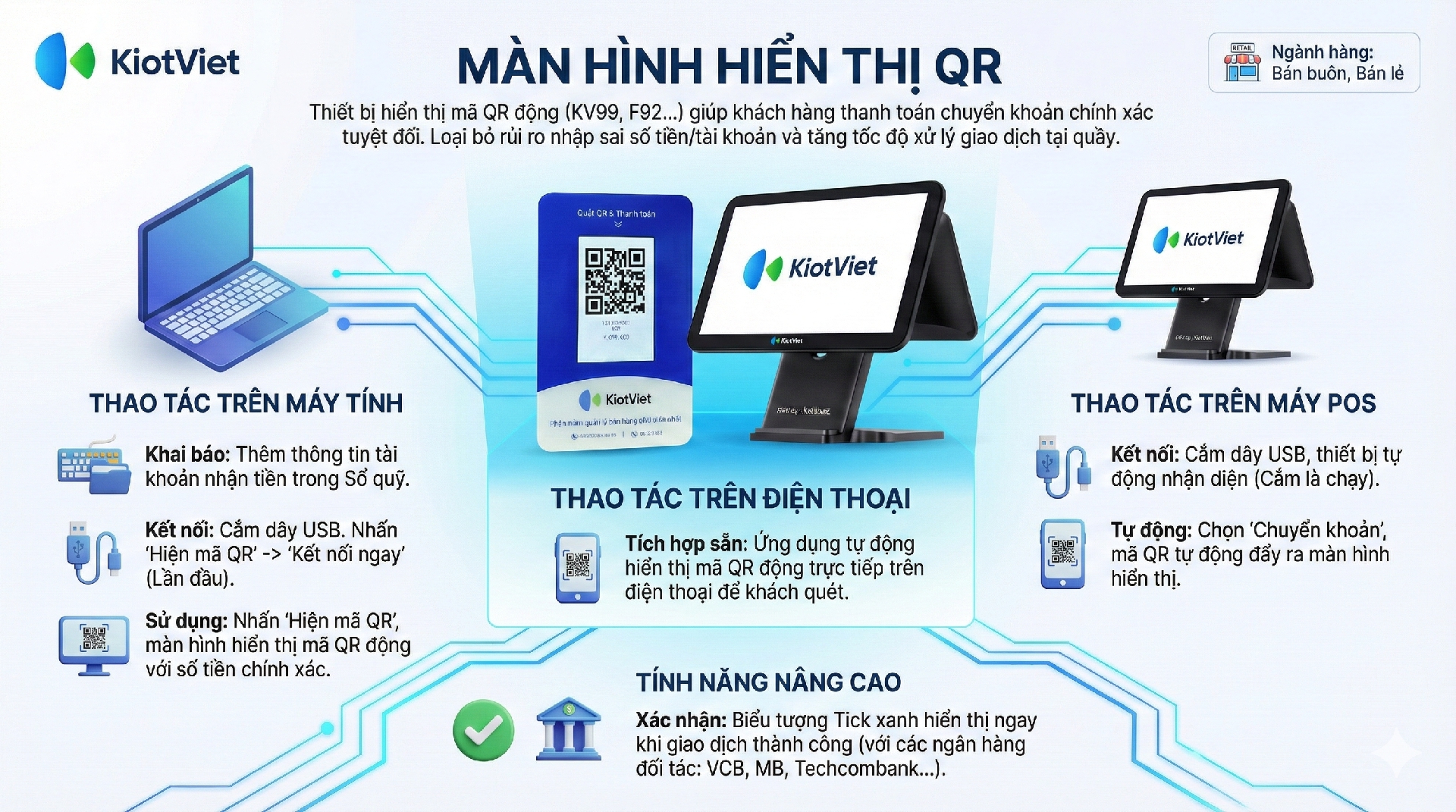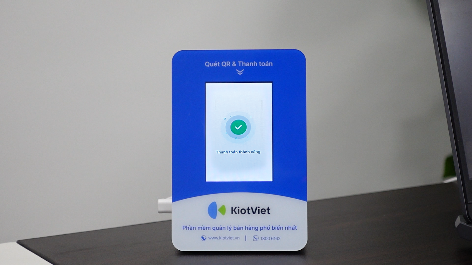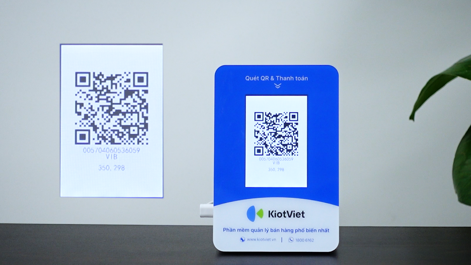 - Giải pháp: Bạn không cần kết nối với màn hình hiển thị QR vật lý. Ứng dụng KiotViet đã tích hợp sẵn tính năng hiển thị mã QR ngay trên màn hình điện thoại của bạn để khách hàng quét trực tiếp.