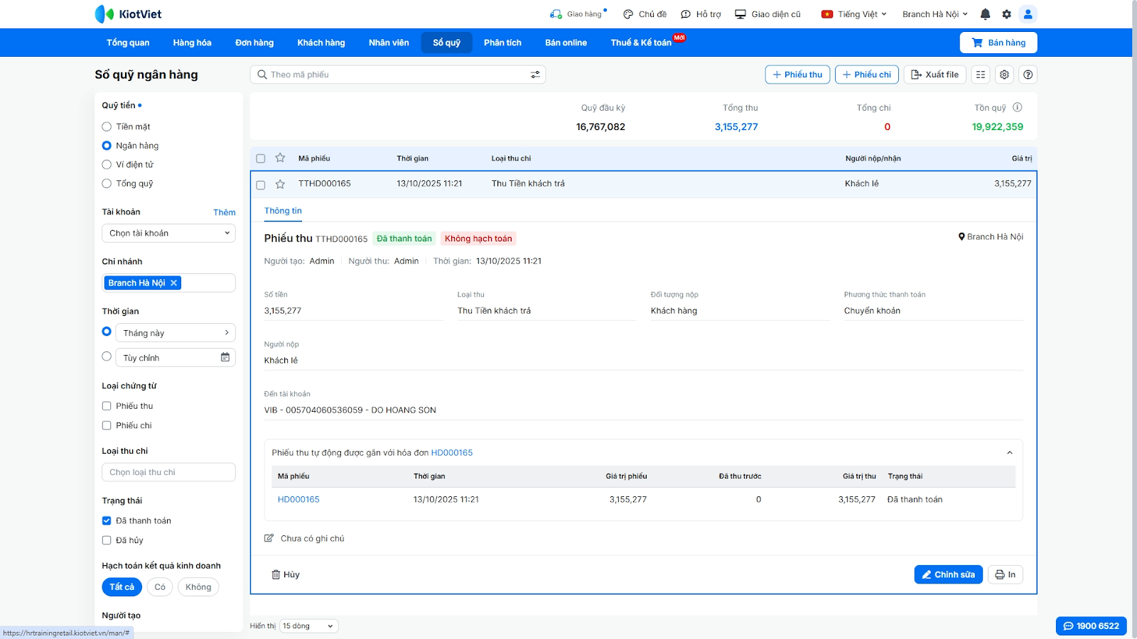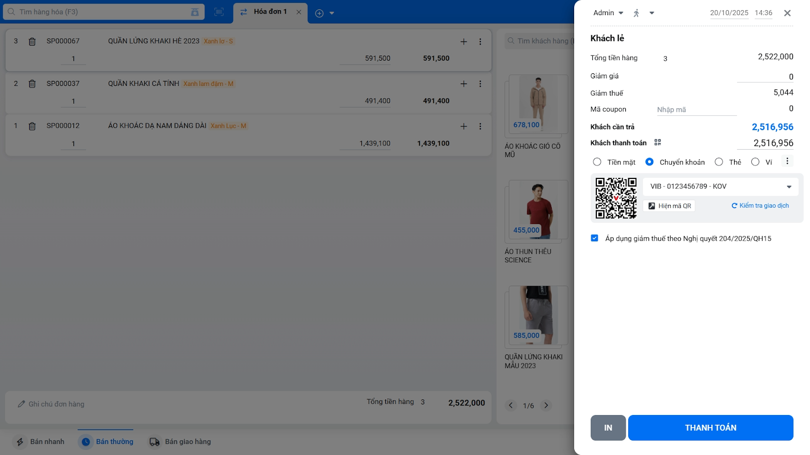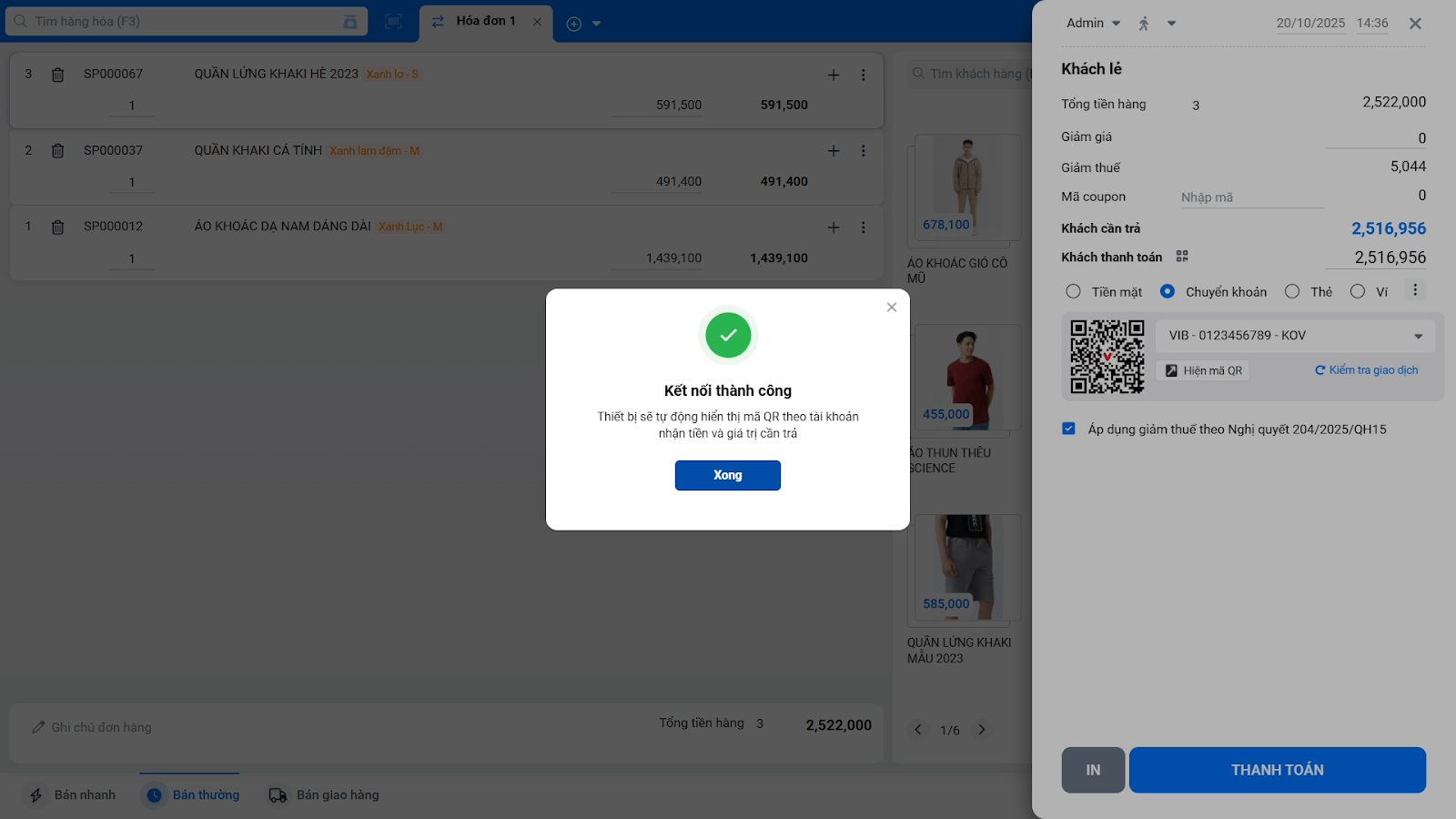 - Sau khi khách hàng chuyển khoản thành công, màn hình bán hàng sẽ hiển thị thông báo. Bạn nhấn Thanh toán để hoàn tất hóa đơn.